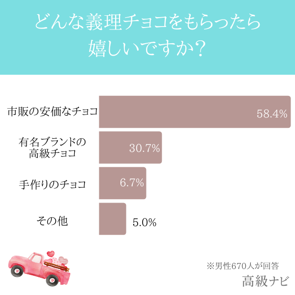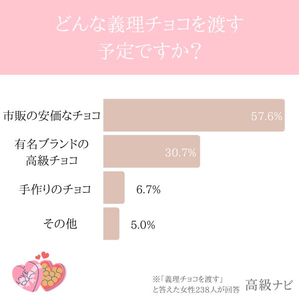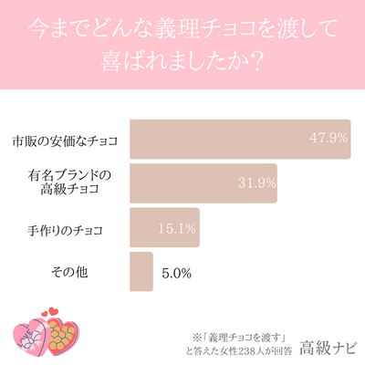 この結果で特に注目したいのは、「市販の安価なチョコ」と「手作りチョコ」の割合です。