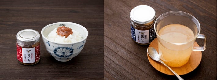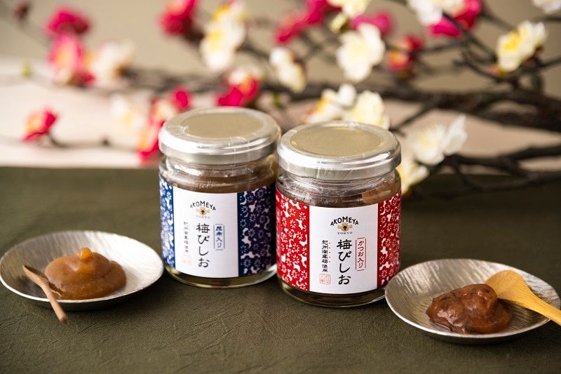 梅肉のペーストに砂糖やみりんを加えて加熱した調味練り梅「梅びしお」。よりご飯に合うよう、紀州南高梅を使用した梅肉に、北海道産がごめ昆布を加えた「昆布入り」と、国産しそと枕崎産かつお節の具を加えた「かつお入り」の2種類。ご飯にのせたり、おにぎりの具、お茶漬け、また昆布入りはお湯に溶いて「梅びしお茶」にもおすすめです。