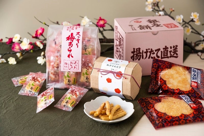 左から)森白製菓 スッキリ梅あられ ¥411、アコメヤの米かりんとう うめ ¥561、銀座花のれん 銀座餅 梅味 ¥1,080