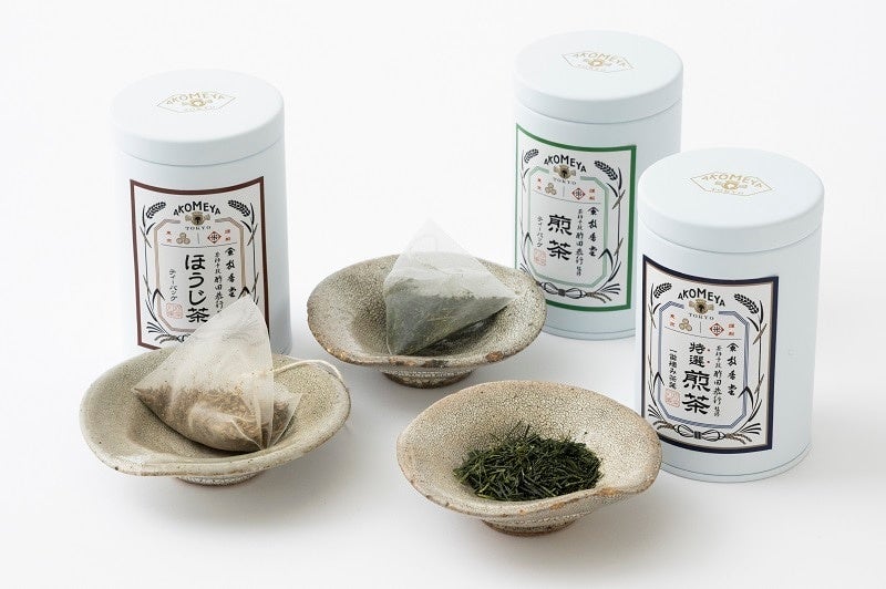 左から)放香堂×AKOMEYA TOKYO ほうじ茶 ティーバッグ ¥1,296、煎茶 ティーバッグ ¥1,296、特選煎茶 ¥1,620