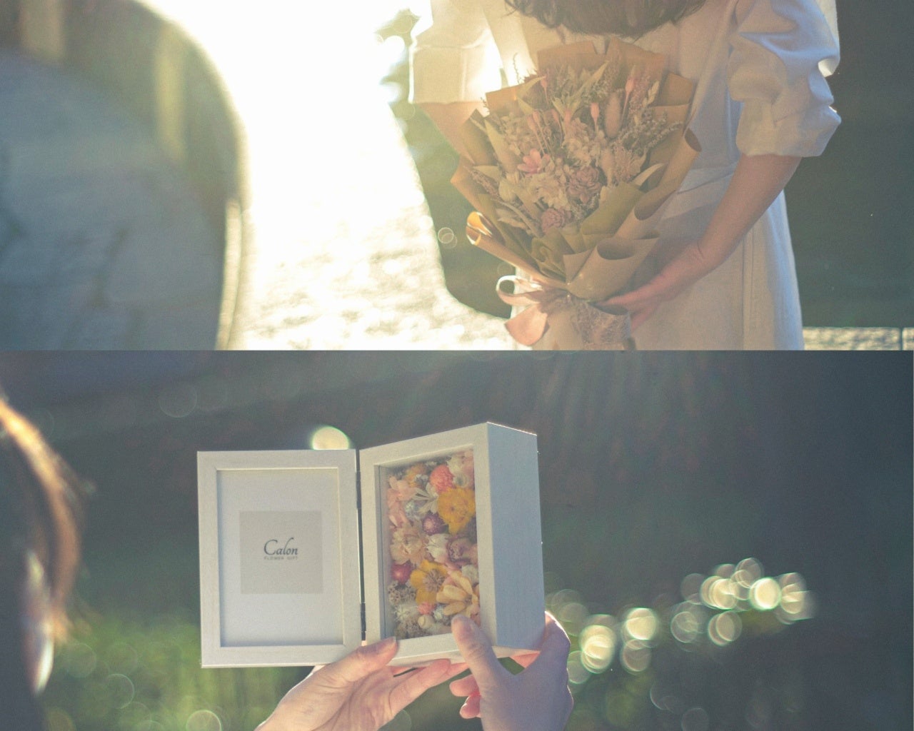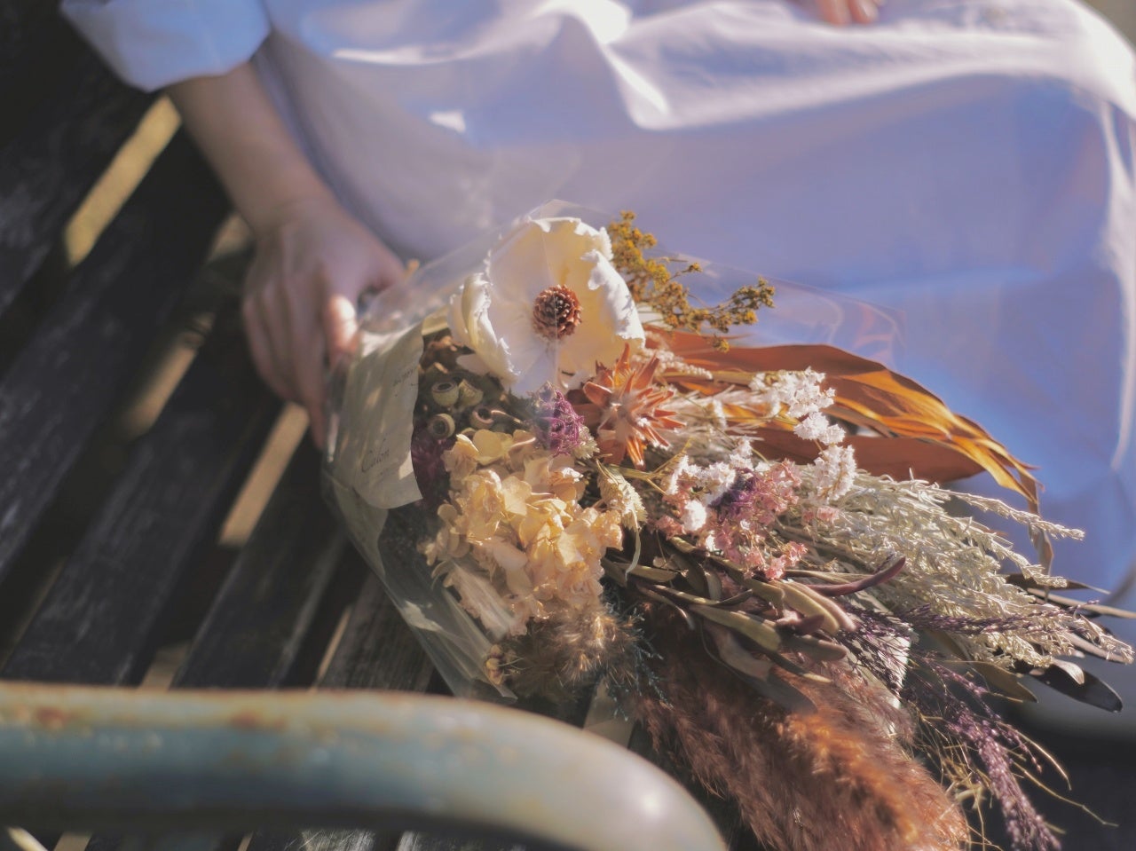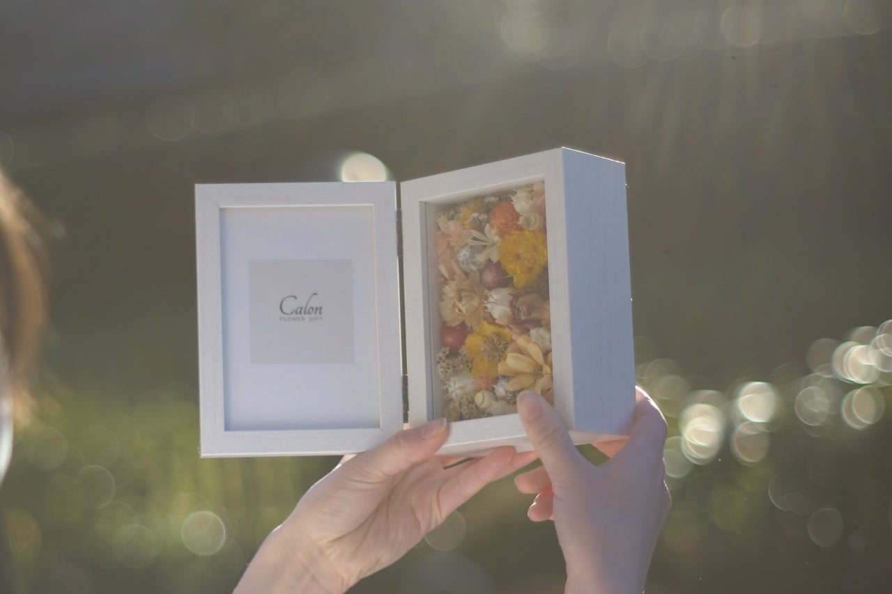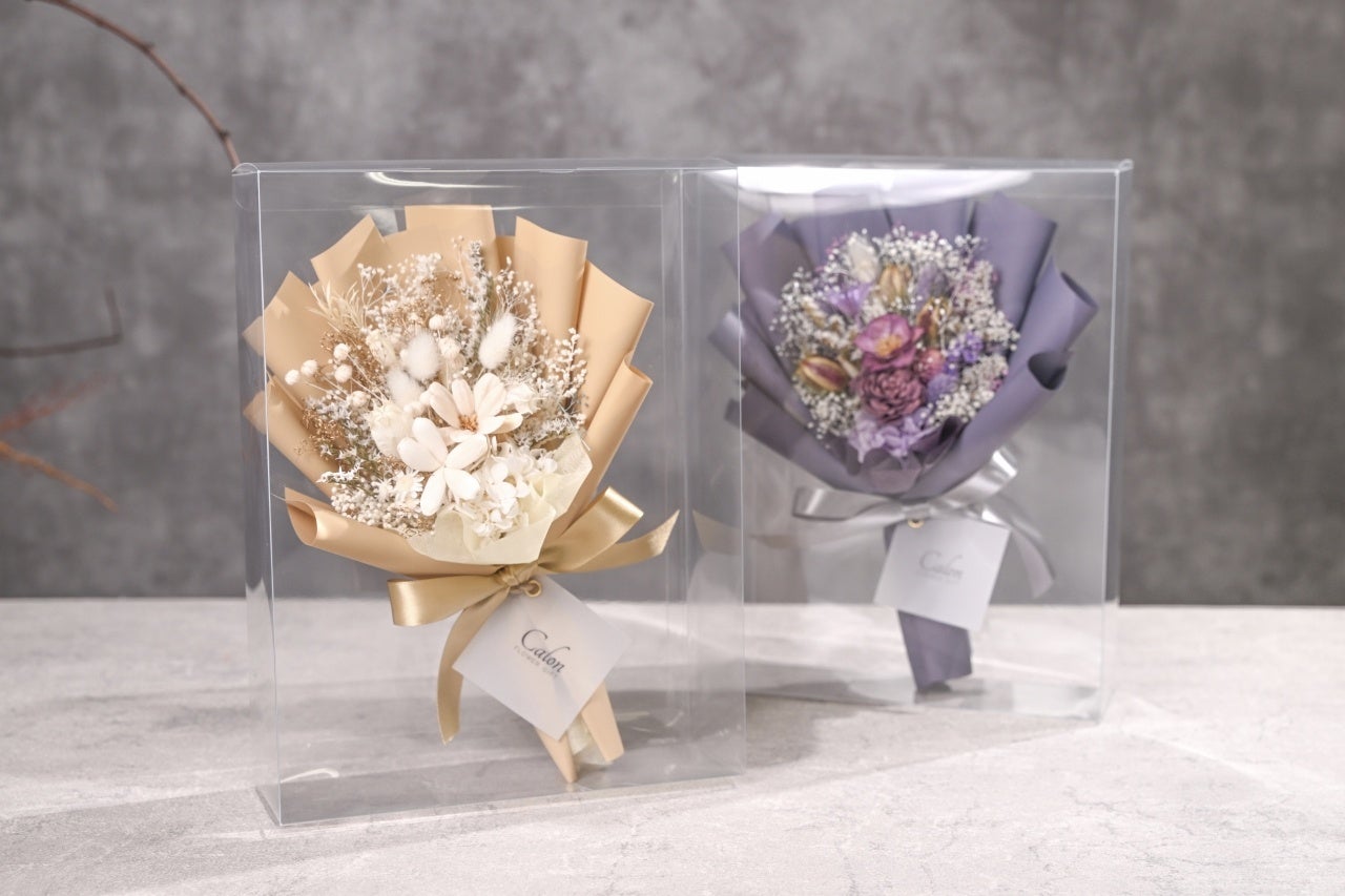 Calon独自のフレアラッピングを施したドライフラワーとプリザーブドフラワーを使用した花束。 誕生日プレゼントや卒業祝い、退職祝い、結婚式でのご両家贈呈用などオールマイティに活用できるギフトです。