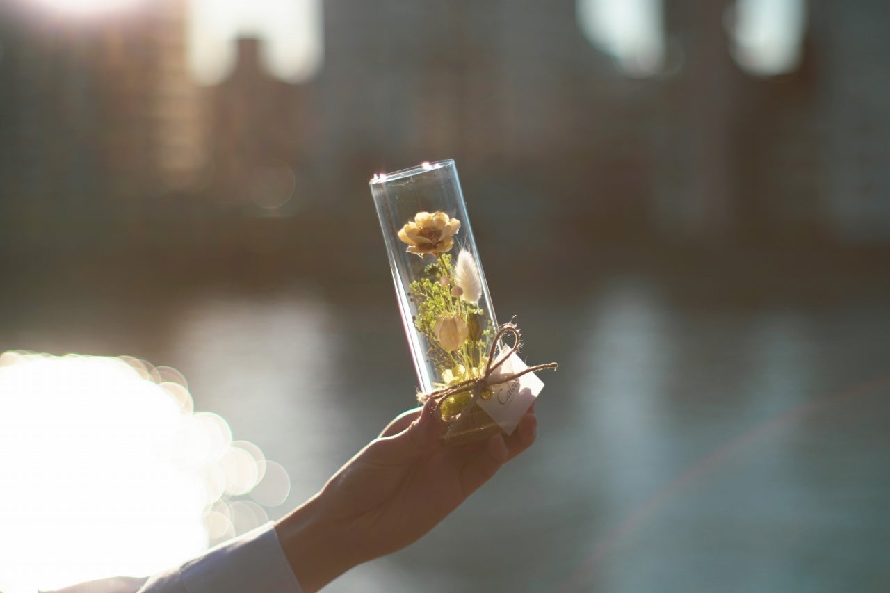 ガラスのボトルに鮮やかなドライフラワーとプリザーブドフラワーを詰め込んだボトルフラワー。お部屋のインテリアやギフトにおすすめ。