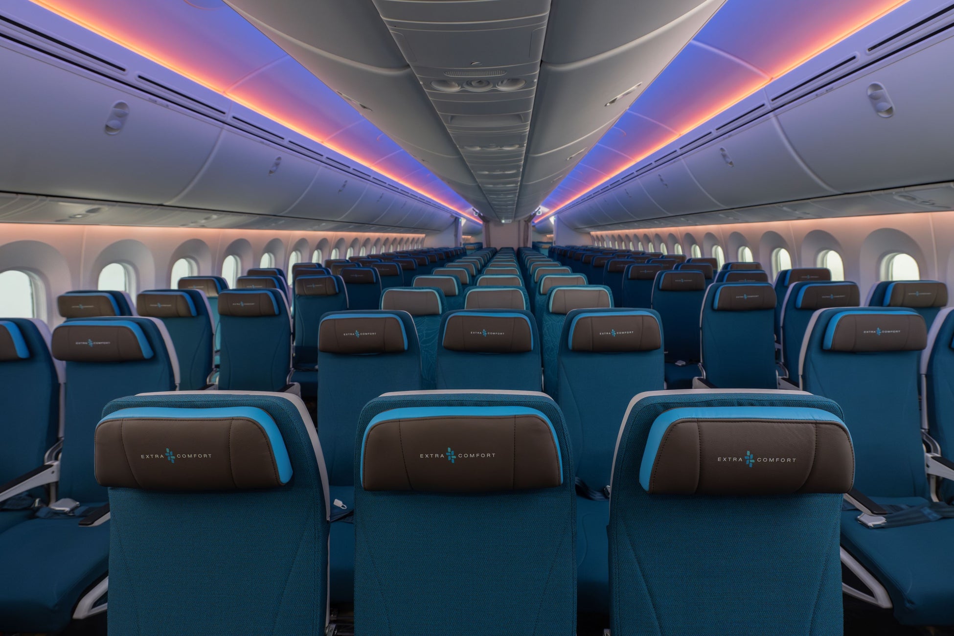 787型機のメインキャビン(エコノミークラスおよびエクストラ・コンフォート)には、人間工学に基づいた背もたれおよびアームレストを搭載したコリンズ・エアロスペース社のアスパイヤシートを266席配置し、シート面積を最大化させ背面と座面にゆとりを持たせており、軽量で近代的なデザインになっています。また、12インチのシートバックモニターとUSB-A およびUSB-C充電ポートも装備しています。