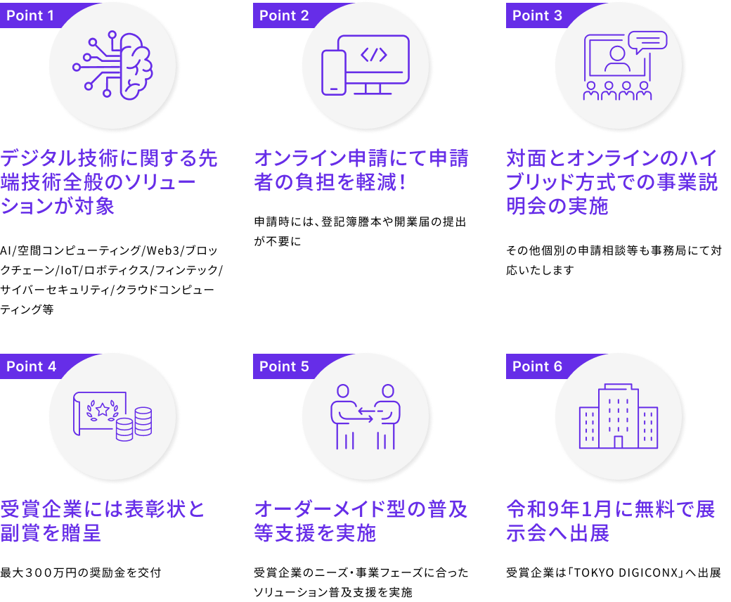 東京都(以下、「都」という。)は、都内中小企業等が有する、AI/XR/メタバース等に代表されるデジタル技術に関する先端技術を活用したソリューション等を表彰するとともに、事業連携先のマッチング支援等を行うことで、その普及を後押しし、都が抱える社会課題解決の加速化を図ることを目的とする「先端技術を活用した社会課題解決促進事業」を令和6年度から実施しています。