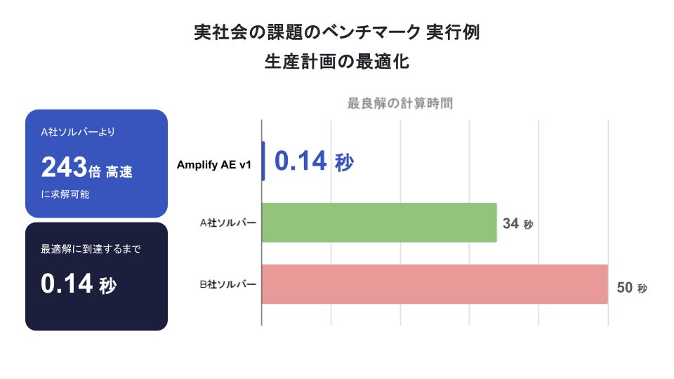最新バージョン「Amplify AE v1.0」は、独自のアルゴリズムと先進的なGPU活用技術の融合により、組合せ最適化問題の求解性能を飛躍的に向上させました。さらに、対応可能な問題の規模と複雑性の限界を大きく引き上げることに成功。これまで技術的な制約からアプローチが困難であった、より大規模かつ複雑な社会課題への応用を可能にします。製造業における設計や生産計画をはじめ、物流や金融など、数多くのビジネスや社会課題に存在する組合せ最適化問題の解決をより強力に支援していきます。