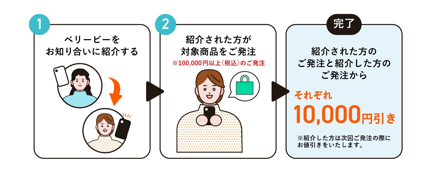 期間中に、「紹介された方(新規注文のお客様)」が、ベリービーで税込100,000円以上ご発注いただくと、紹介した方・紹介された方双方に10,000円のお値引きをプレゼントいたします。