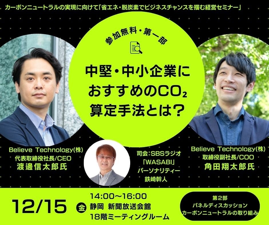 ここ近年、カーボンニュートラルに向けた取り組みを始める企業が増えています。中でもCO₂排出量(Scope1,2,3)の可視化は、削減目標や削減策を検討するうえで必要不可欠です。今回のセミナーでは、大企業から中小企業まで幅広くCO₂排出量算定支援を行うビリーブテクノロジーが、算定の実務についてわかりやすく説明します。