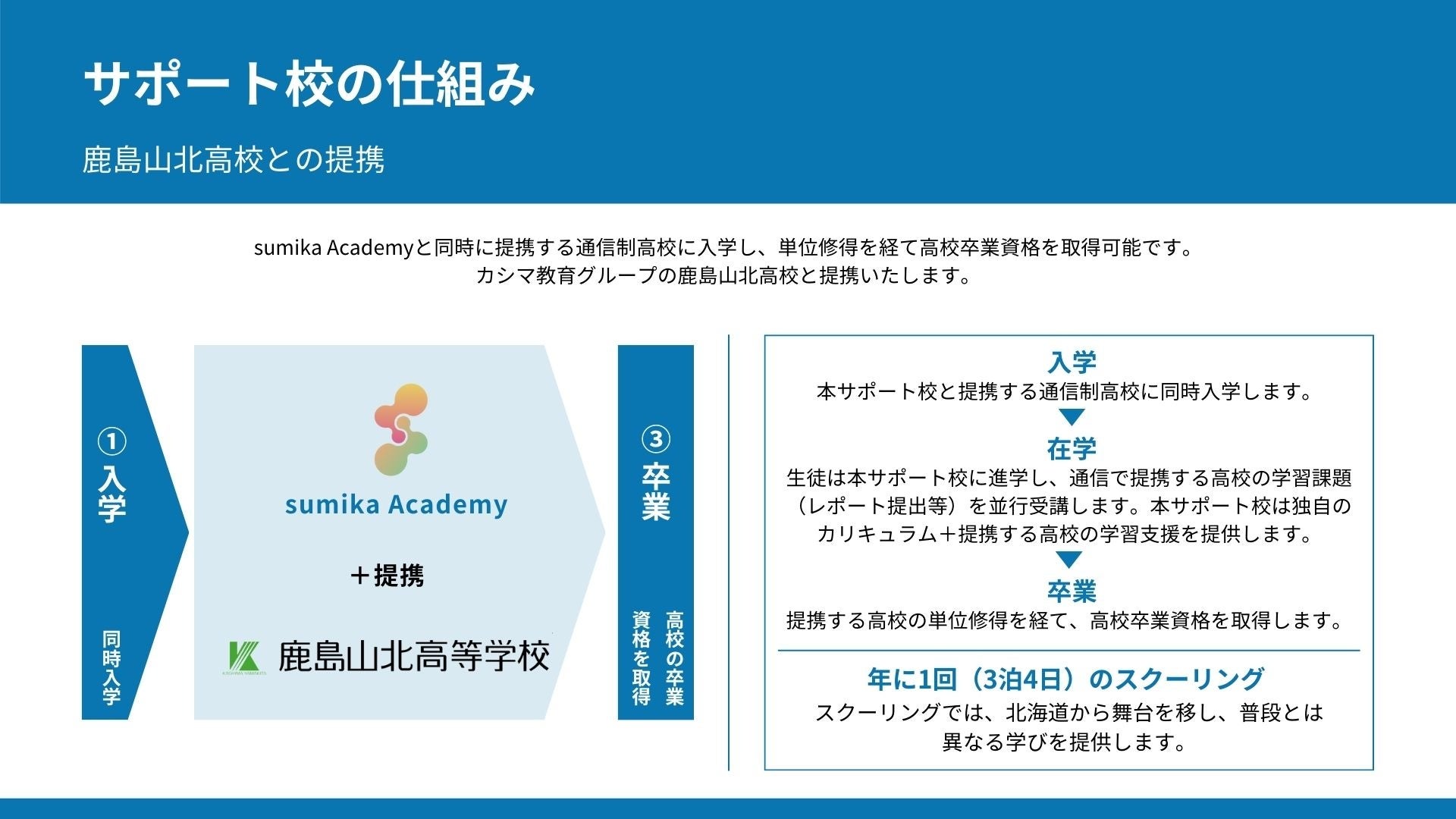 sumika Academy札幌本校は、「鹿島山北高等学校」と提携し、高校卒業資格の取得と一人ひとりの進路のサポートを行います。