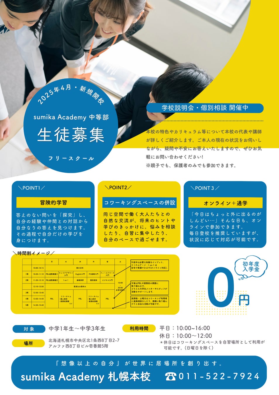 sumika Academy札幌本校の開校と同時にsumika Academy中等部を開校します。中等部は中学1年生〜3年生を対象としたフリースクールとなっております。2025年4月1日より入学希望者の募集を開始いたします。個別相談のお申し込みはsumika Academy本校へお問い合わせください。