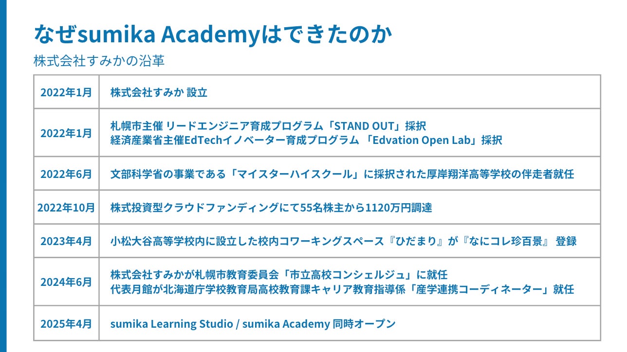 株式会社すみかは、教育関係人口1億人を掲げ、学校教育のキャリア教育・探究学習の支援を通じて、子どもたちが社会とつながりながら学び、成長できる環境を創出してきました。3年間で6000名を超える学校教育の支援をし続け、次は学校に通えなくなった生徒へも等しく支援する必要性を感じ、sumika Academyを設立いたしました。