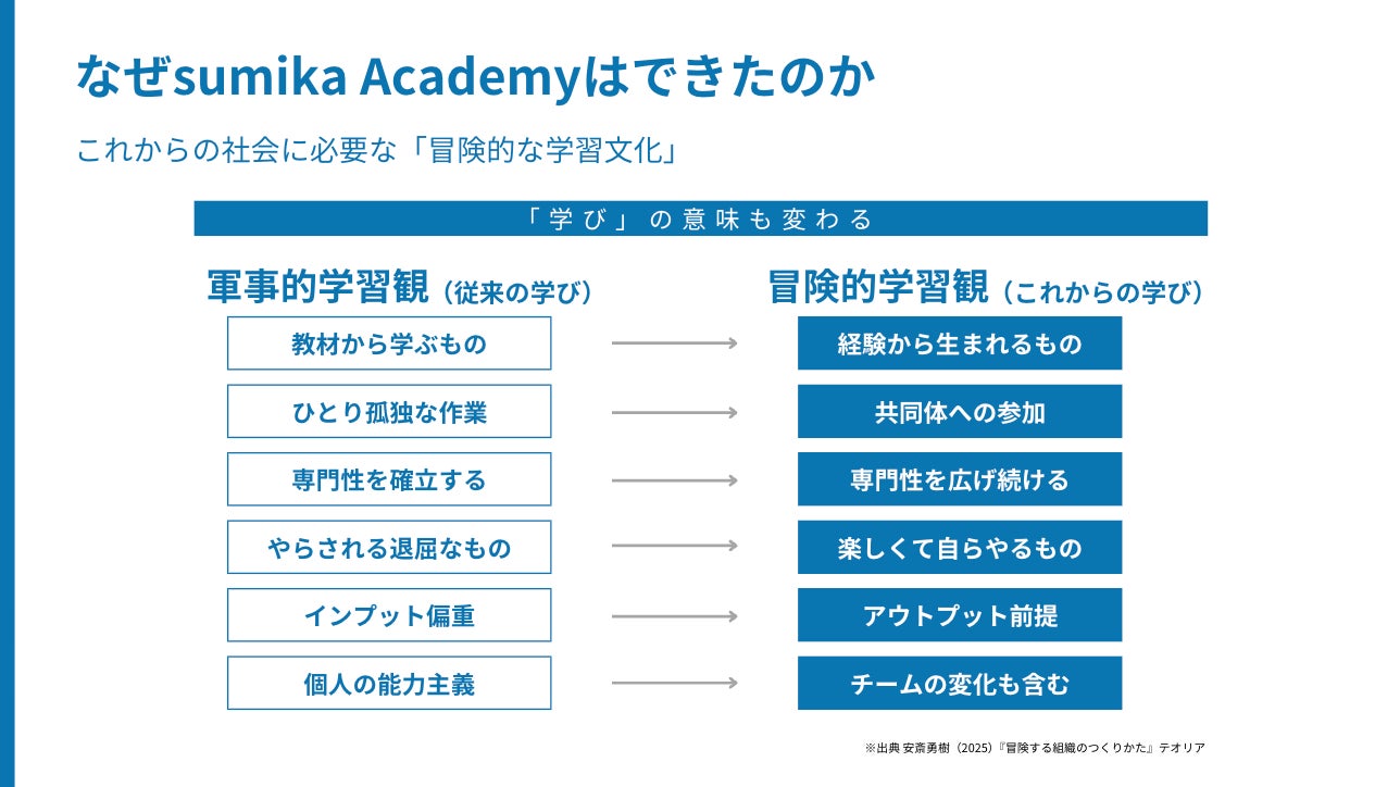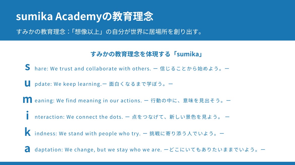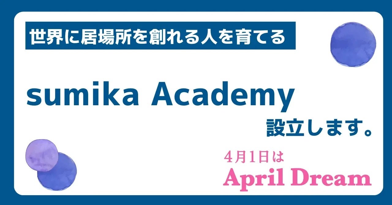 ※弊社では、PR TIMESにて実施されている夢を発信する日にしようとする企画にて2023年4月1日に「sumika Academy」の開校についてリリースさせていただきました。2年という月日を経て、本日正式な開校のリリースをさせて頂きますことに、関係各所へ改めてこの場をお借りし御礼申し上げます。