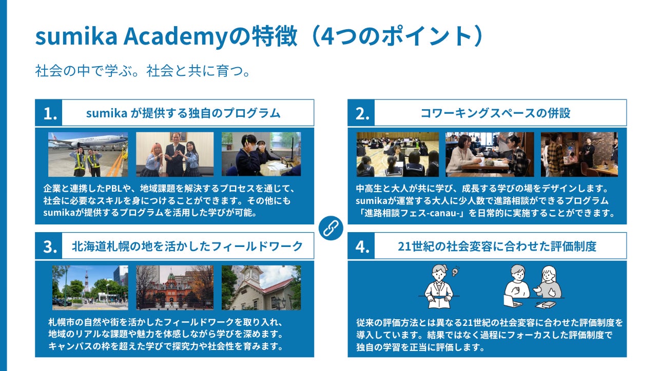sumika Academy札幌本校では、これまで株式会社すみかが実施してきた独自のコンテンツを主軸に、探究学習やPBLを中心とした学びを行います。また、校舎に併設されるコワーキングスペース「sumika Learning Studio」(以下、すみスタ)との連携により、多様な大人との関わりの中で、社会の中で学ぶというスタンスを大切にしていきます。