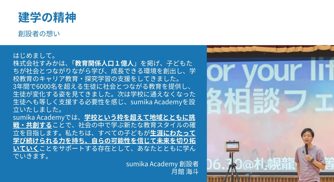 sumika Academyの教育は、これからの時代を生きる力を育む全く新しい教育です。従来型の教育を根底から見つめ直し、時代にフィットしたニュースタンダードな学びを生徒と共に創り上げていきます。コワーキングスペースが併設された通信制サポート校は、株式会社すみかが提唱する学びのスタンスである「社会の中で学ぶ」を体現した場であり、ここから新しい教育と、その教育に多くの教育関係人口のみなさまとご一緒できることを楽しみにしております。北海道から日本の教育を大きく前進させられる挑戦をしていきたいと思います。