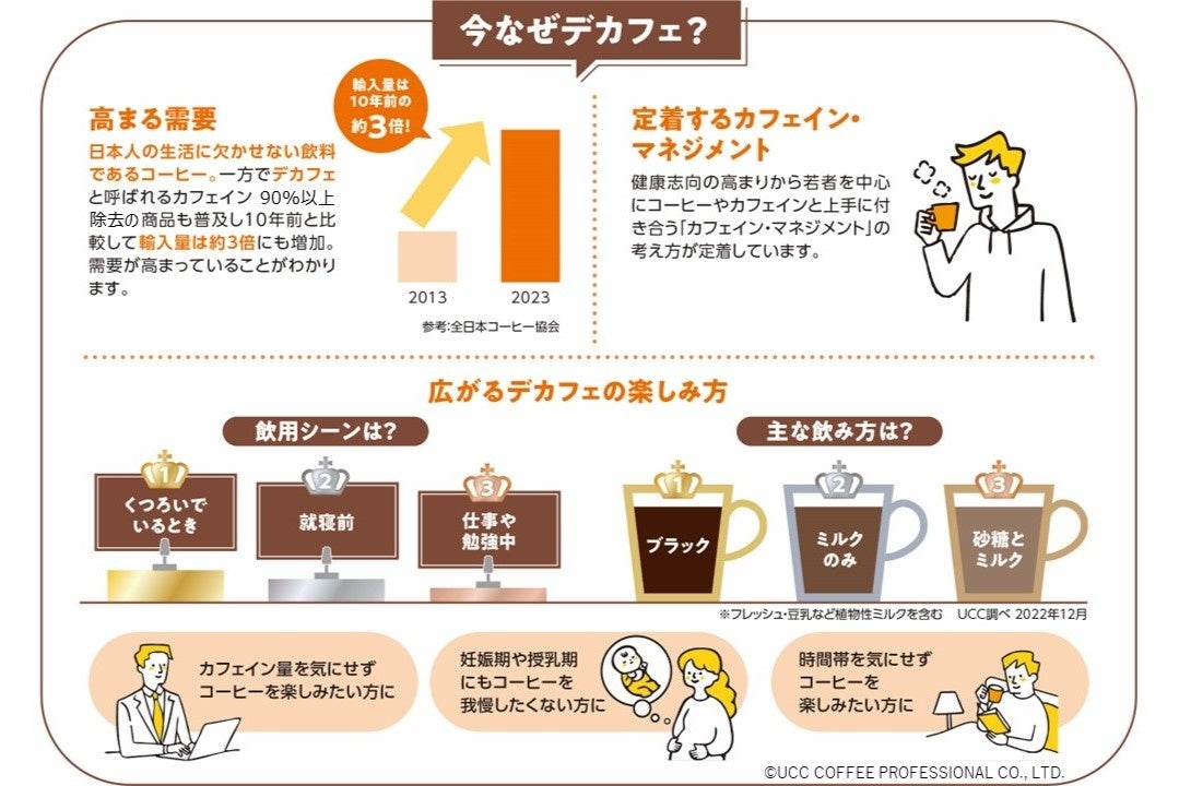 今や日本人の生活に欠かせない飲料となったコーヒー。中でもデカフェコーヒー(カフェインを90%以上除去したコーヒーをデカフェと表示できる)は、全日本コーヒー協会の調査データによると輸入量が10年前と比較して約3倍にも増加し、需要が拡大しています。また昨今では、カフェインを摂取する量やタイミングを調整する 「カフェイン・マネジメント」 という考え方が広がってきました。デカフェコーヒーの飲用シーンも多様化し、リラックスしたいときや就寝前、仕事や勉強中など、オンオフ関係なく選ばれています。