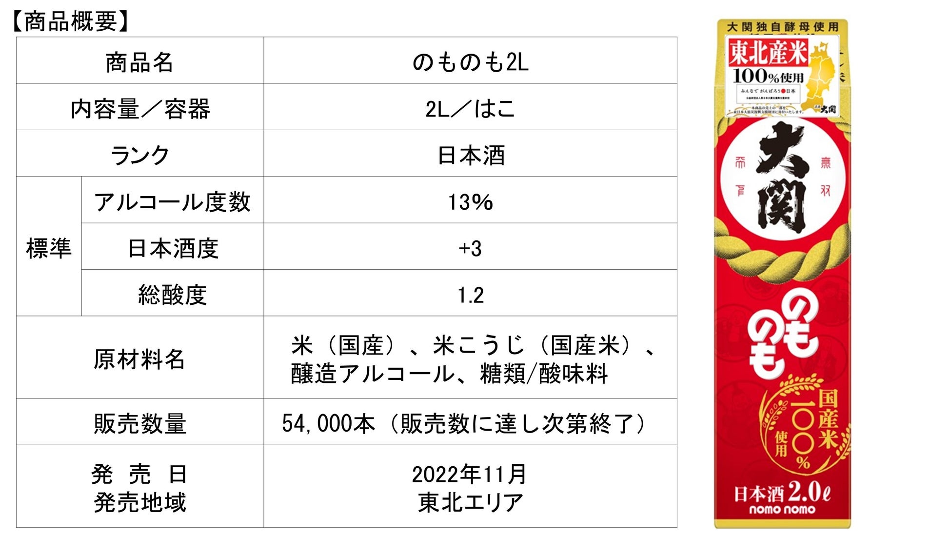 この秋にデザインをリニューアルした「のものも」の味わいはそのままに原料となるお米を東北産米100%で仕込み、容器は日本酒市場で最もポピュラーなサイズである2Lパックに詰めました。