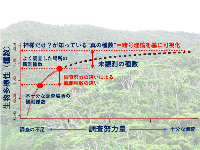 生物多様性の総量を把握することは、実は、研究者も含めて人々が考えている以上に難しい問題なのです。と言うのも、地球上全ての生き物の分布を、実際に観測するのは不可能だからです。したがって、世界中の研究者が収集したあらゆるデータを統合して稼働化し、データベースを構築することが第一に重要です。その上で、有限なデータから、生物多様性の全体像を統計数理的に定量することになります。