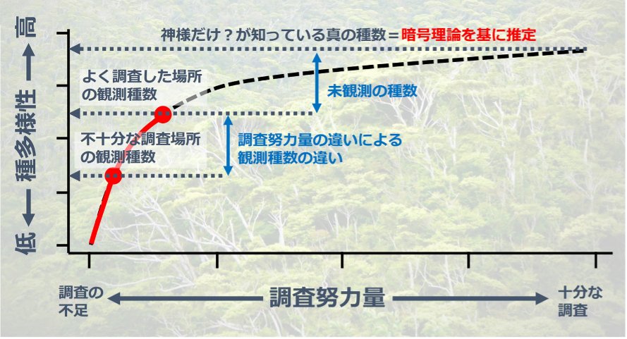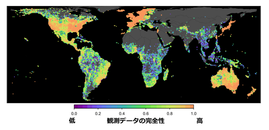 樹木の分布は、地球上で不均等に調べられているため、場所によって情報の完全性が異なります。観測データをもとにした種多様性は、情報の完全性の影響を受けています。このため、ある場所で観測された種多様性が低い時に、本当に種多様性が低いのか、単に観測が不十分なだけなのかが分かりません。