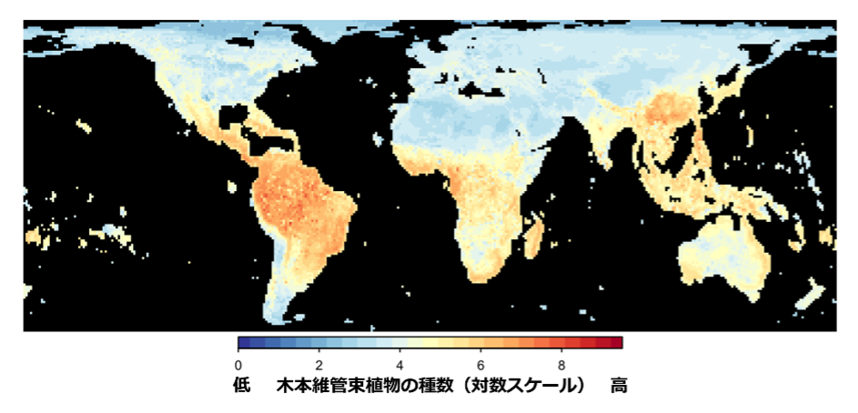 さらに、本論文では、暗号理論による種多様性推定を基に、機械学習(AI)技術を用いて、樹木の分布に影響を及ぼす環境要因(気温、降水量、地形など)から、種多様性を予測するモデルも構築しました。これによって、世界の陸域を完全網羅した樹木多様性地図を作成することができました。