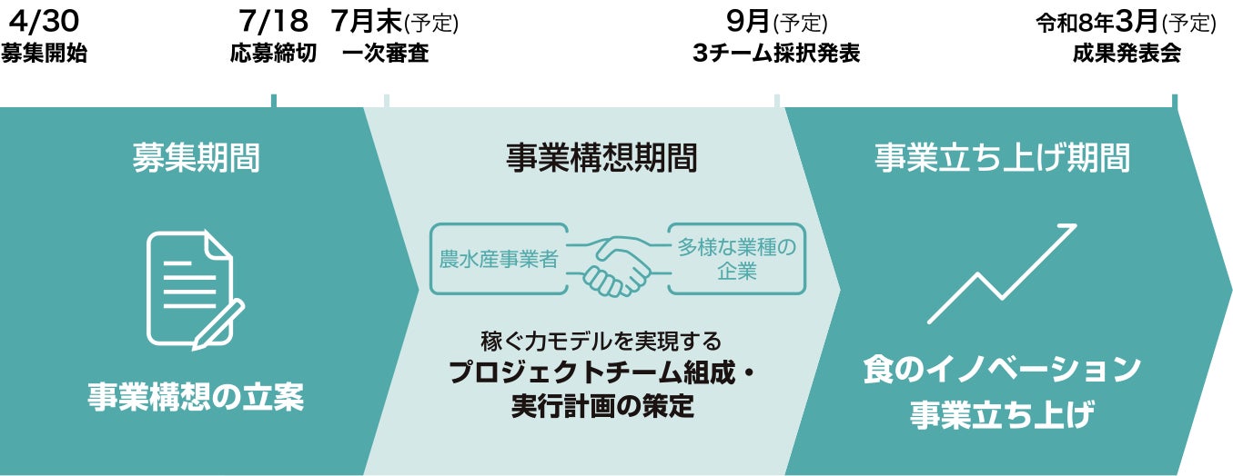 これまで本事業では、様々な事業者へのヒアリングを通じて食のバリューチェーン全体のリアルなニーズ・課題を発掘し、食の「稼ぐ力」を高める事業モデルの仮説構築を行ってまいりました。開始以来3年間継続的に取り組みを進めてきた結果、昨年度には、事業創出に果敢に挑戦してきた採択事業者が、支援期間を経て自立的に次のフェーズへ踏み出すなど、本事業の成果が着実に表れ始めています。今回の募集では、農水産事業者をはじめとする食のイノベーションに取り組む意欲的な事業者がプロジェクトチームを組成し、イノベーション事業の創出にチャレンジすることで、県内産業の振興に資する「稼ぐ力」ビジネスモデルの創発を目指します。