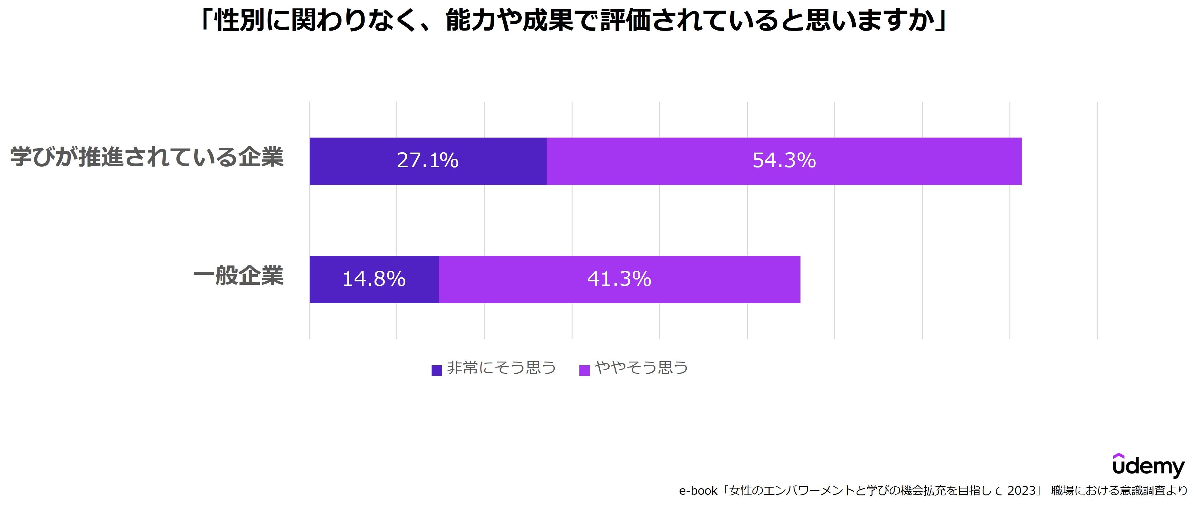 調査では、「性別に関わりなく、能力や成果で評価されている」と回答した人が81.4%に上り、一般企業の回答56.1%と比べると大きな伸びが見られます。「学び」が推奨される職場環境では、能力や成果で評価されていると感じている人が多いことが分かりました。これは「学び」がもたらすエンパワーメントの影響かもしれません。