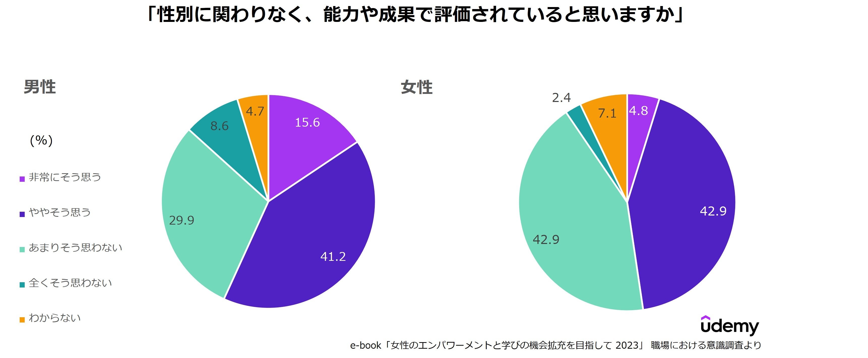 「性別に関わりなく、能力や成果で評価されていると思いますか」という質問では、「非常にそう思う」と回答した男性は、なんと女性の3.25倍。男性の方が性別に関わりなく、能力や成果で評価がされていると認識している人が多いことがわかりました。一方、女性の回答者を年代で見てみると女性30代では50%、40代では71.4%が能力や成果で評価されているとは「思わない」と回答。すなわち、職場における性別による差別を感じている女性が、とても多いことがUdemyの独自調査からも、改めて浮き彫りになりました。