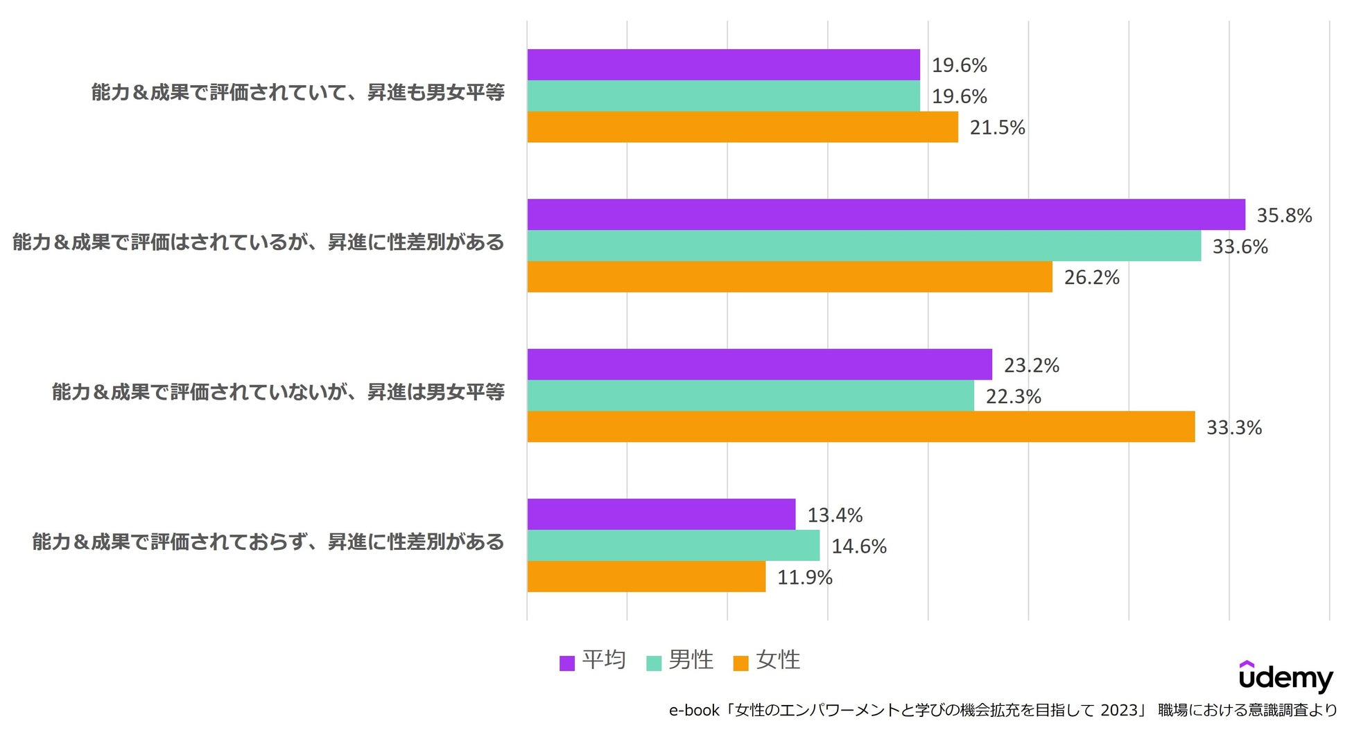 この2つの質問を掛け合わせてみてみると、「評価は能力や成果でされているが、昇進・昇格に性差別を感じる」という意見が全体で35.8% (男性33.6%、女性26.2%)で最も多いことがわかりました。一方、女性に注目をすると「能力や成果で評価されていないが、昇進は男女平等」だと思っている人が33.3%で一番多く、男女間で評価や昇進に対する考え方が大きく異なることが改めてわかりました。