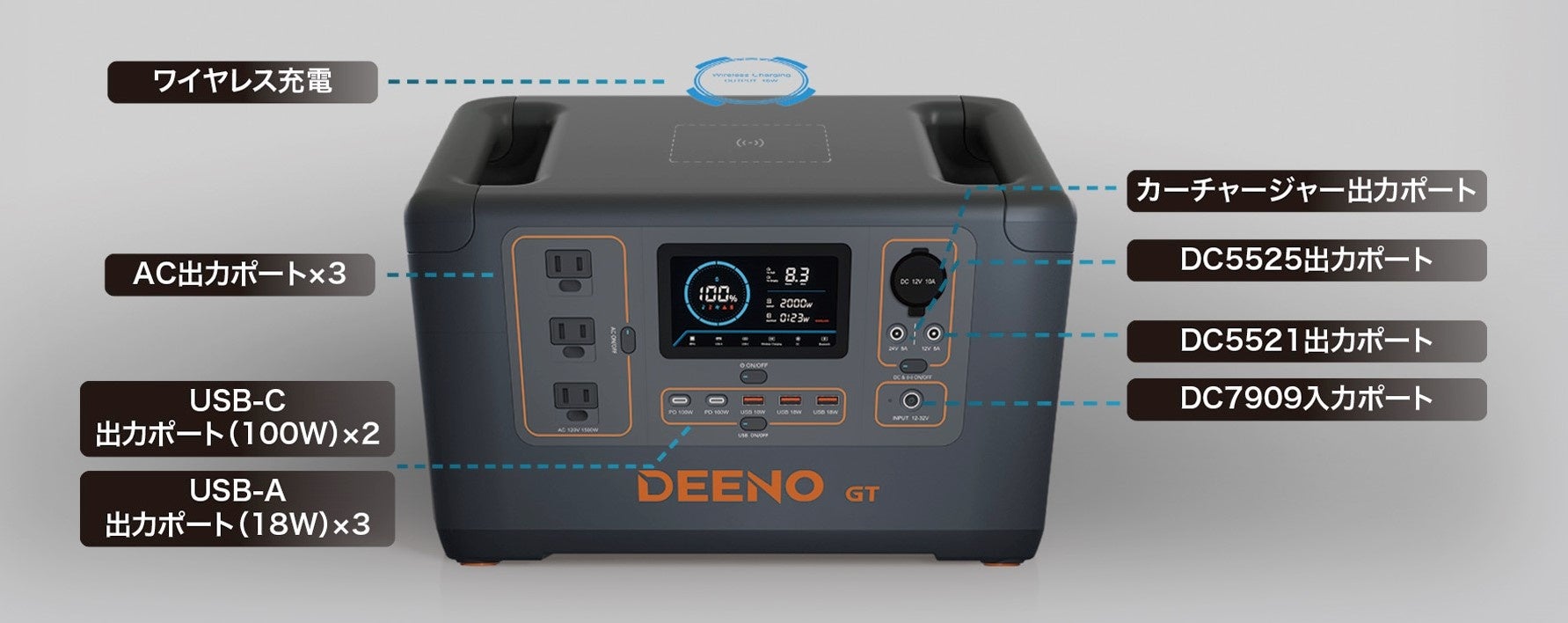 1036Whの超大容量、出力1500W(瞬間最大3000W)のハイパワー仕様でさまざまな電気製品に対応。3つのAC出力ポートをはじめ、3つのUSB-A出力ポート(18W)、2つのUSB-C出力ポート(100W)、ワイヤレス充電、2種類のDC出力ポート、カーチャージャー出力ポートを装備し、同時に最大12台の機器へ電力を供給できます。