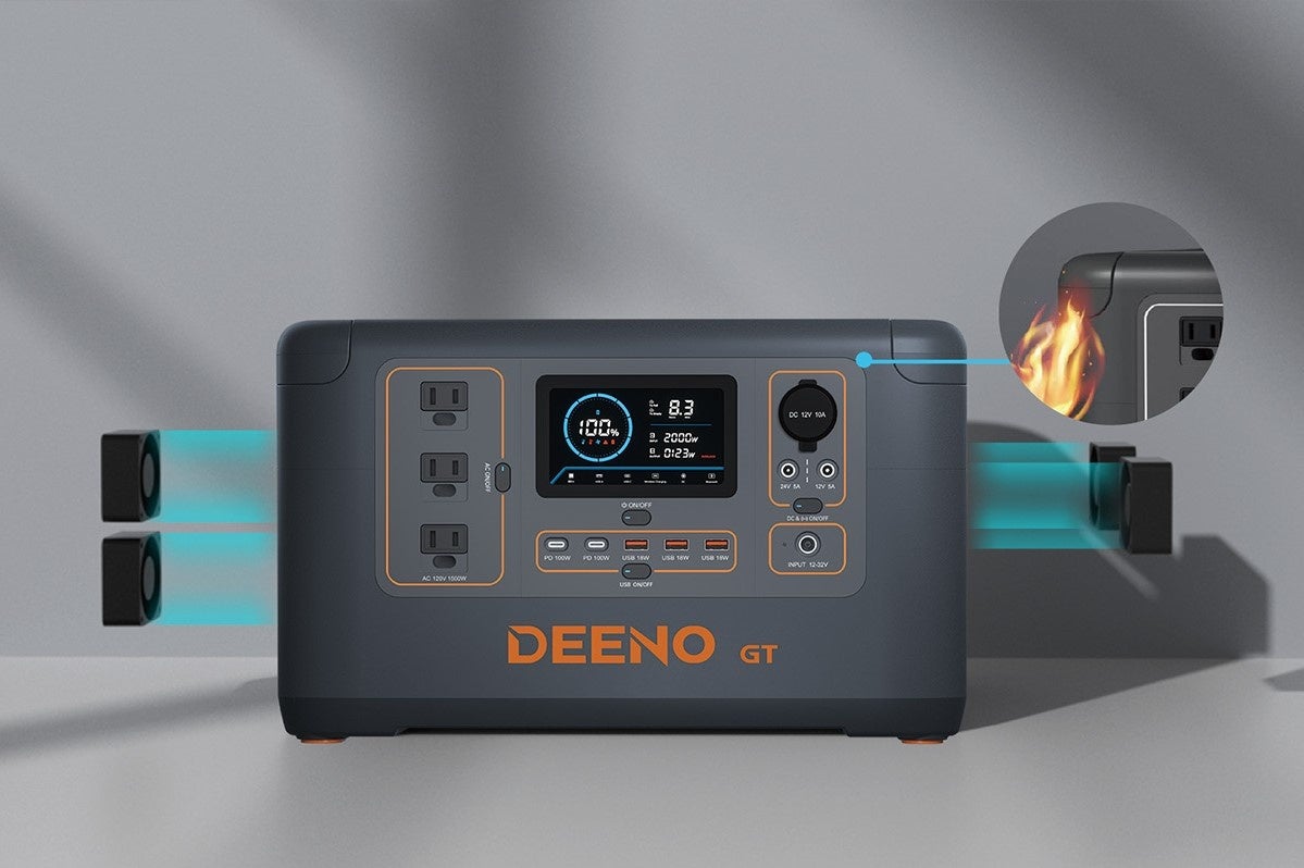 「DEENO S1500」は、長寿命かつ安全性の高いリン酸鉄リチウム電池、DEENOが独自に開発したポータブル電源向けバッテリー管理システム『DEENO Intelligent Battery Management System (BMS)』を搭載。筐体には高性能冷却ファンや、衝撃性能を保ちながらも難燃性の高い材料を採用することで内側から外側まで総合的に保護し、優れた安全性を確保しています。