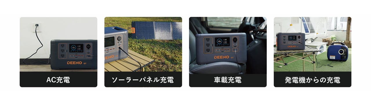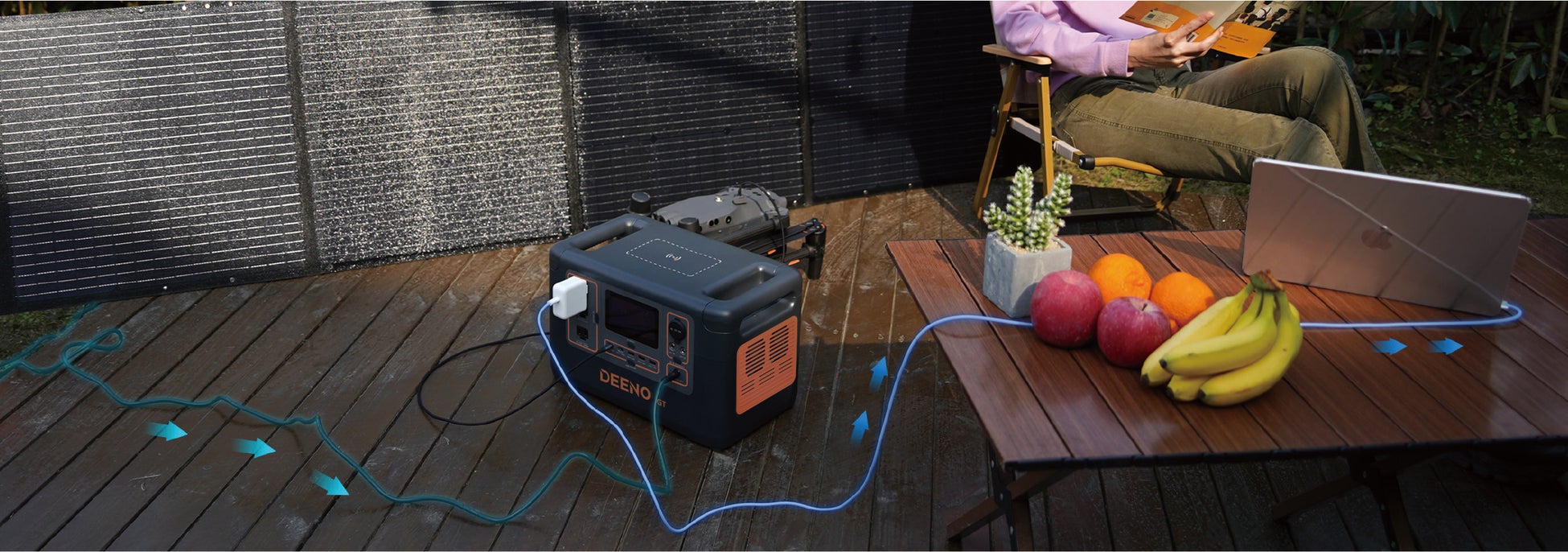 MPPT(Maximum Power Point Tracking)機能で太陽エネルギーを効率的に吸収して充電時間を短縮。DEENO 200Wソーラーパネル(別売オプション)を使用すれば約6時間で充電できるので、屋外での長期間使用も可能です。また充電しながら、冷蔵庫やノートパソコンなどの機器への電力供給も行えます。