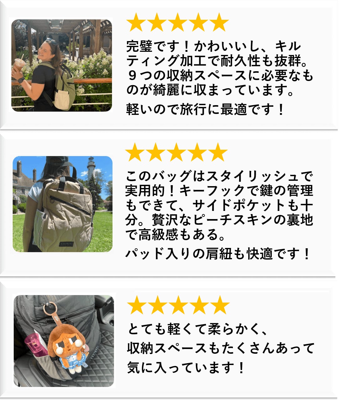 海外のメーカー直販サイトでは200件ほどの高評価レビューを獲得し、「最高の旅行用バッグ」「きれいに整理できる」「軽いのに頑丈」と世界中の旅行者から絶賛されています。