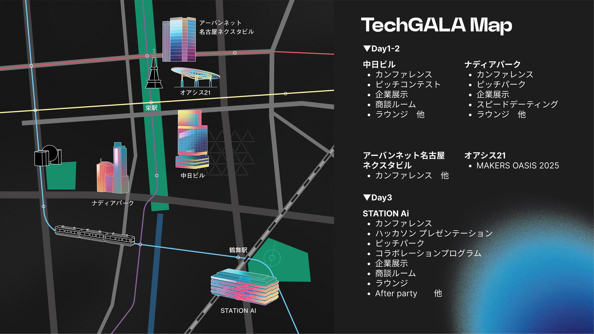 一般社団法人中部経済連合会、名古屋大学、愛知県、名古屋市、浜松市等で構成され、愛知、名古屋、浜松地域のスタートアップ・エコシステムの形成を目指す「Central Japan Startup Ecosystem Consortium」は、2025年2月4日から6日にかけて参加者5,000名規模のテクノロジーの祭典「TechGALA Japan」を愛知県名古屋市の栄地区・鶴舞地区の会場を中心に開催します。