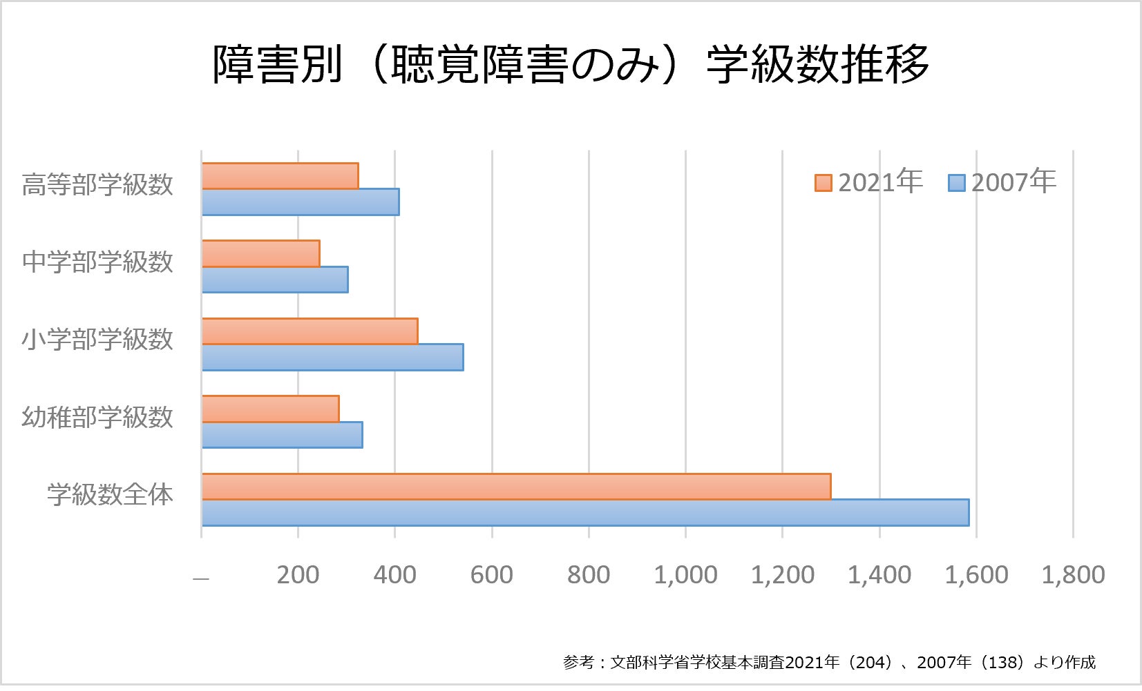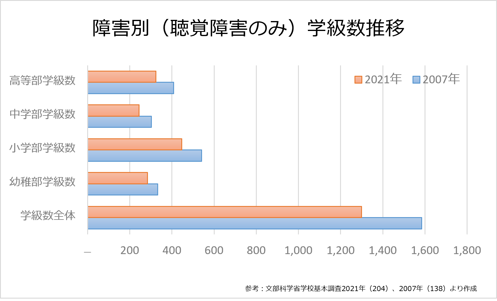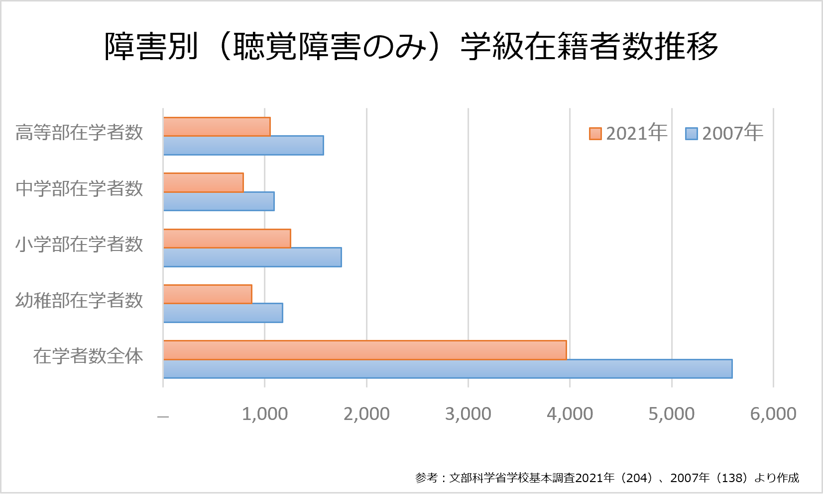 国内でも聴覚障害を抱える子供たちを取り巻く教育環境は変化しつつあります。文部科学省の2021年および2007年の学校基本調査によると、障害別(聴覚障害のみ)学級数と在籍者数は減少傾向にあります。これは聴覚障害を抱える子どもたちが健聴の子どもと共に学ぶケースが増えていることを示しています。