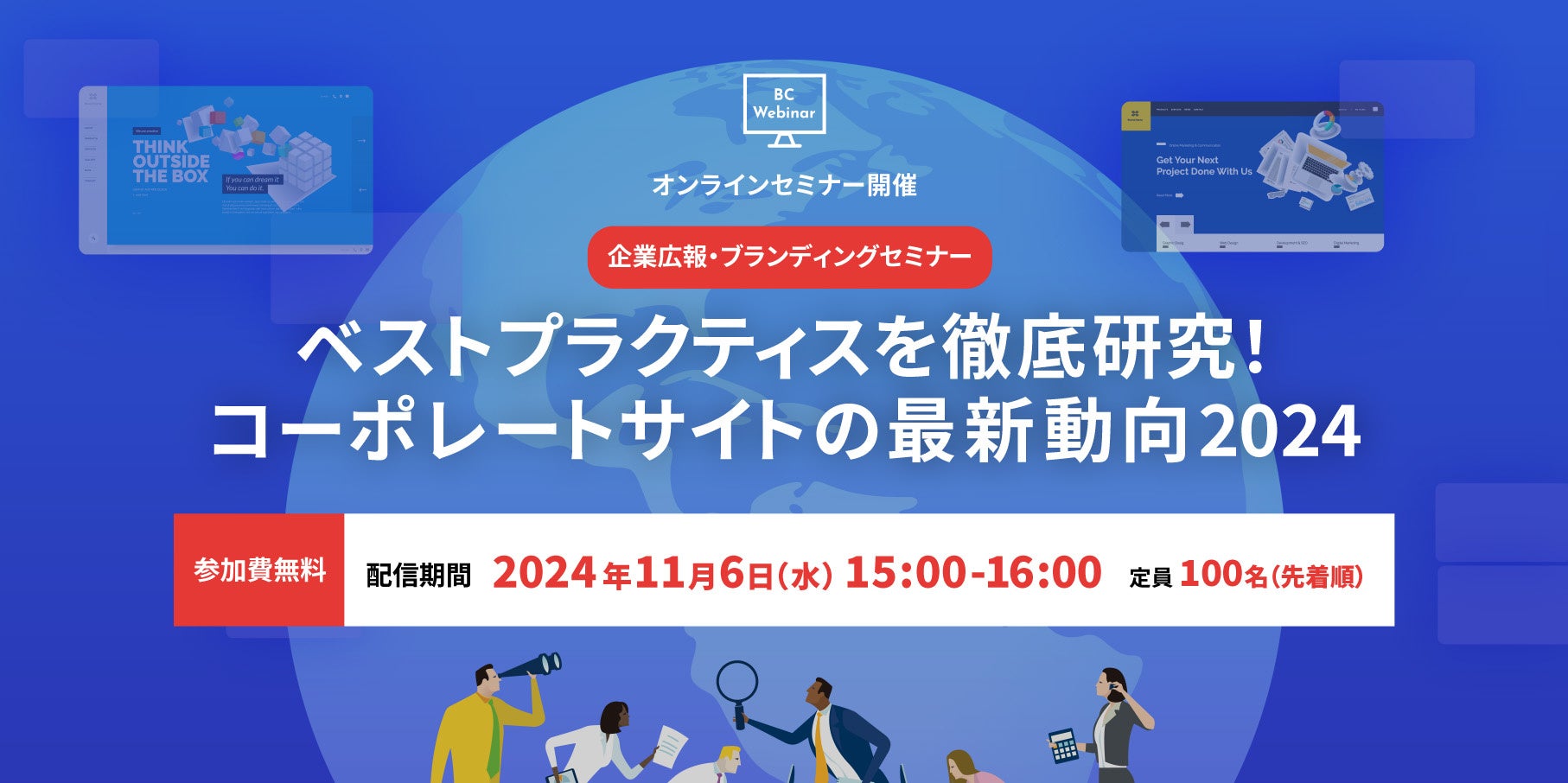 株式会社ブレーンセンター(大阪市北区、代表取締役:稲田紀男)は、近年企業における最重要コミュニケーションツールとなっているコーポレートサイトの在り方について、独自調査の結果をもとにした最新トレンドを解説するウェビナーを開催します。パーパスやビジョン、価値創造ストーリーの発信、サステナビリティも意識したコーポレートブランディング、ESG投資家や海外投資家からの開示ニーズの高まり、NISAを背景とした個人投資家の増加など、目まぐるしく変化するトレンドの変化を踏まえて、優良事例を解説します。