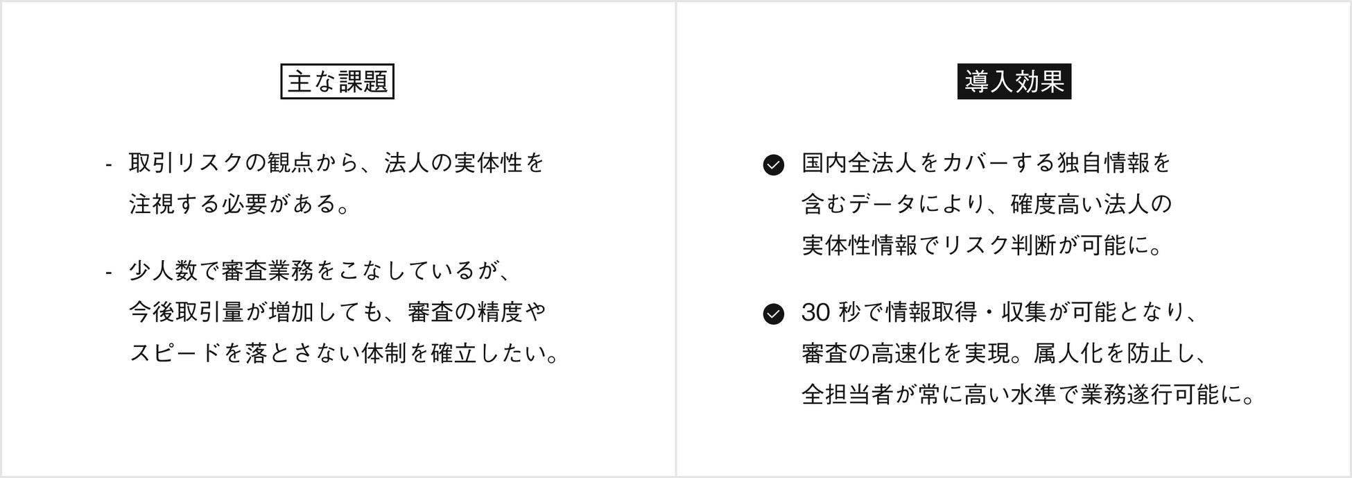 ビジネス機会の拡大とコンプライアンスを両立するにあたって、煩雑かつ負荷が重い定性情報の調査の効率化・高度化の実現が重要であると当社は考えています。