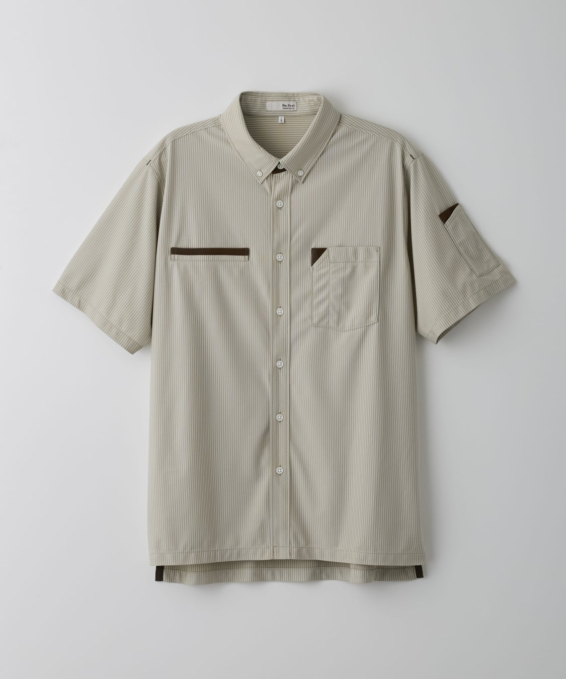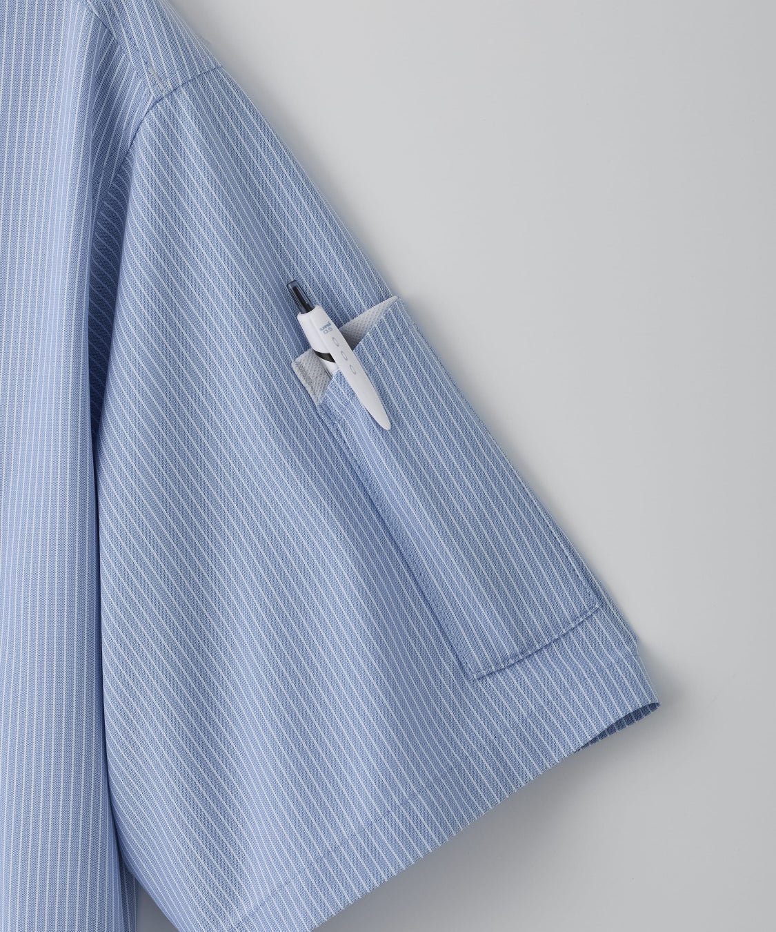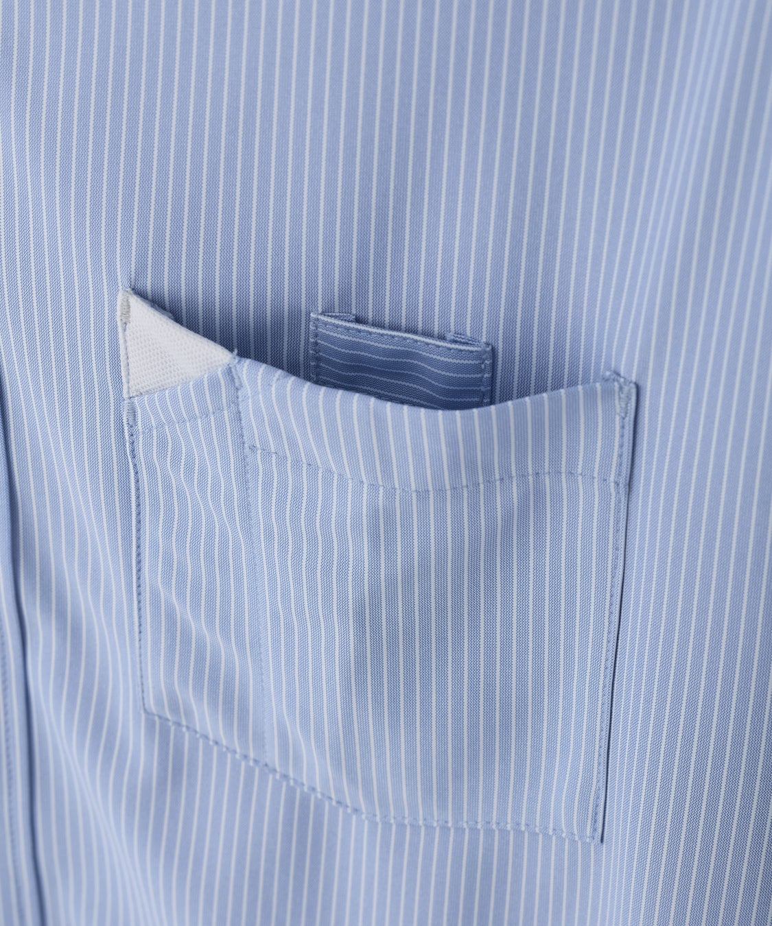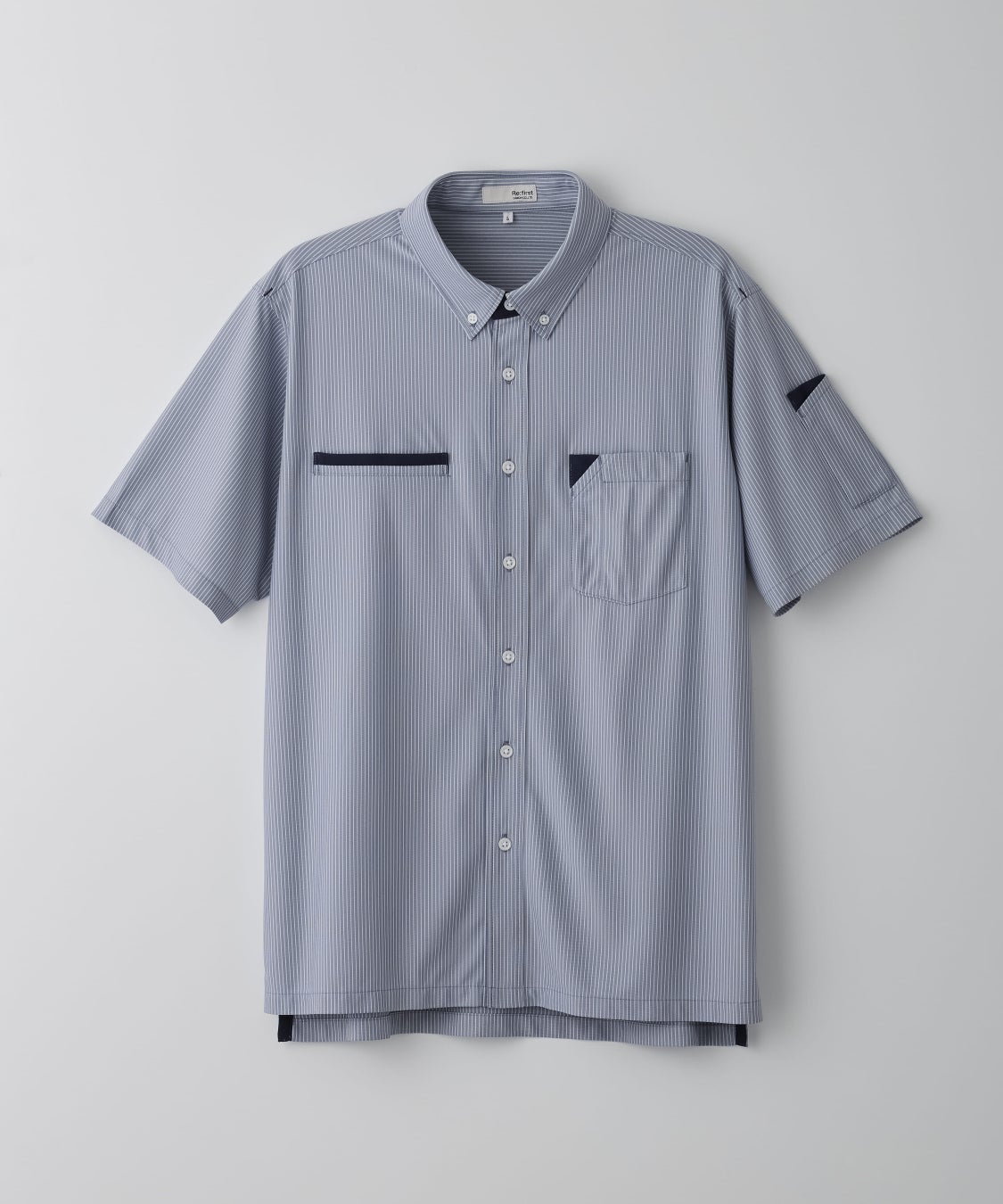 着る人を選ばないストライプ柄に配色デザインをプラスしたスマートな印象のシャツ。昨今の猛暑による「暑さ」への課題を多く耳にし、吸水速乾性のある肌離れの良い生地を採用しました。
