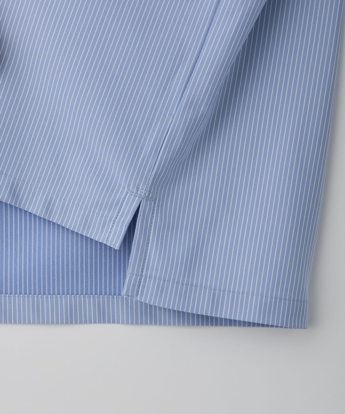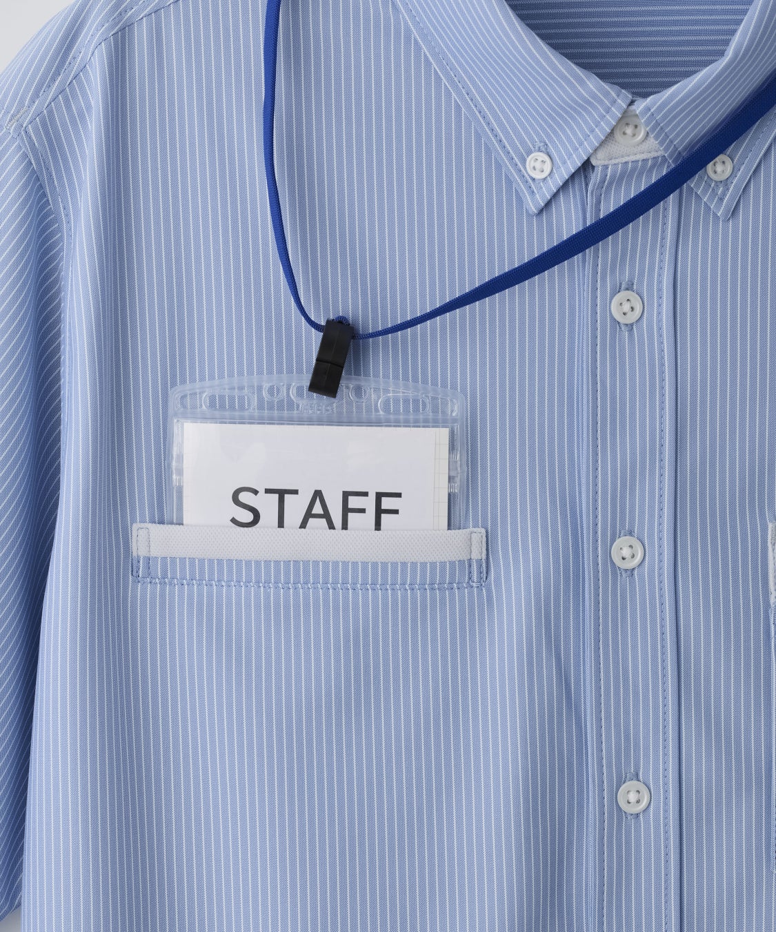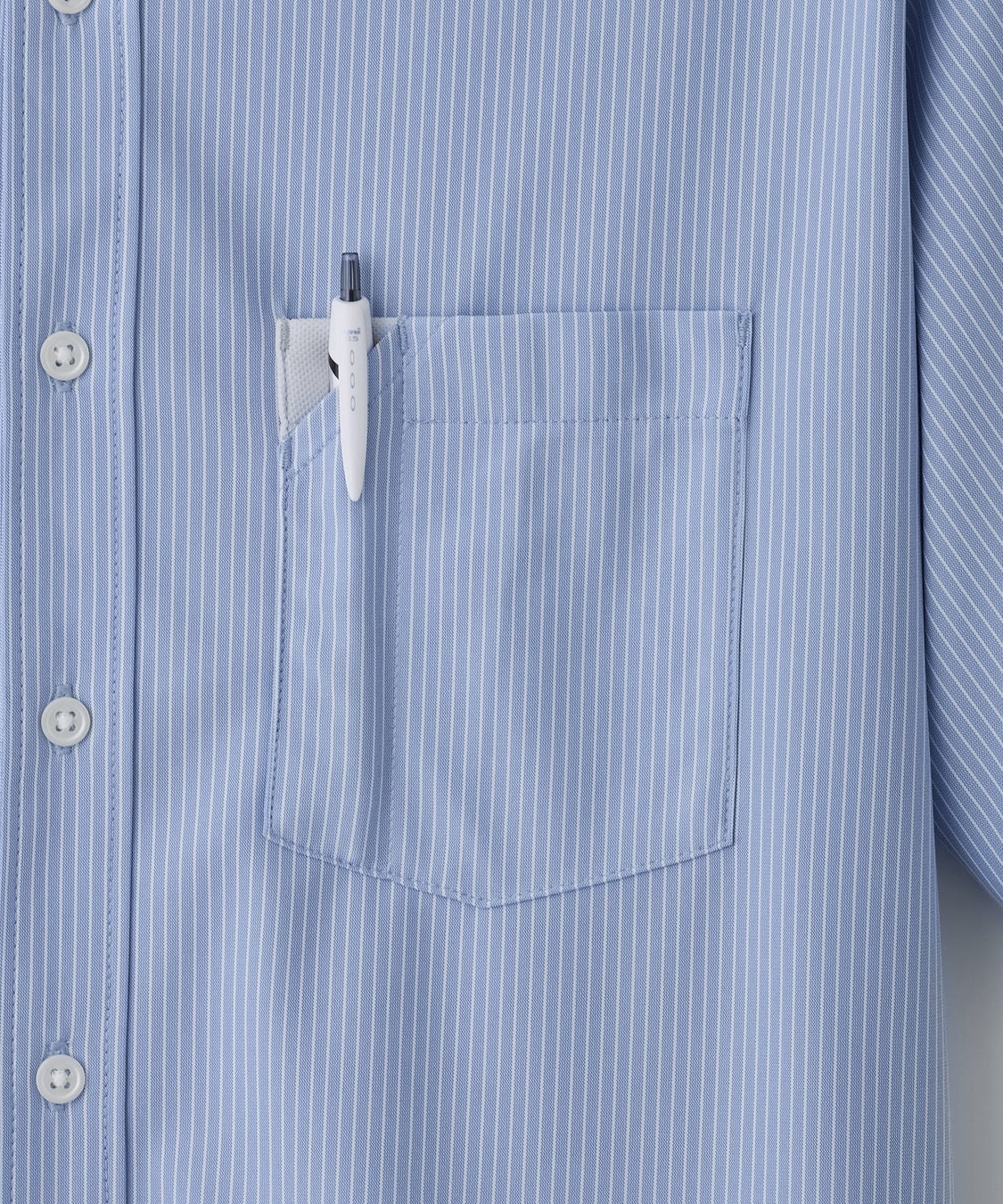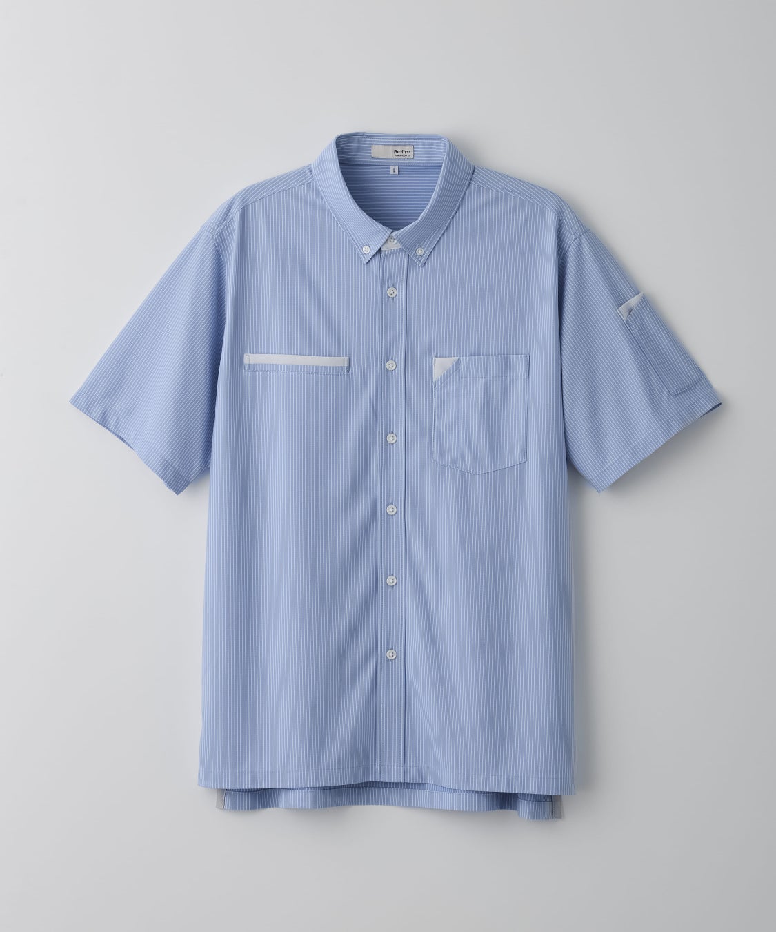 着る人を選ばないストライプ柄に配色デザインをプラスしたスマートな印象のシャツ。昨今の猛暑による「暑さ」への課題を多く耳にし、吸水速乾性のある肌離れの良い生地を採用しました。