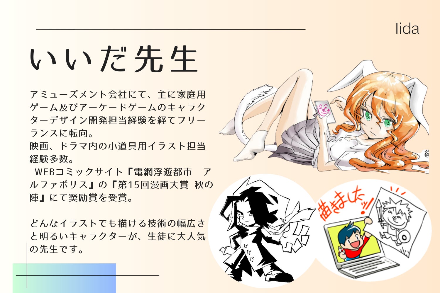 講師は全員、現役のイラストレーター・漫画家。普段は、子どもデザインアカデミーにて講師をしているので、子どもたちの心をつかむのがとても上手な先生ばかりです。