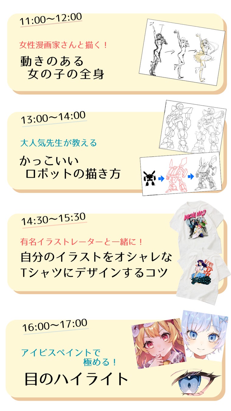 当日は4人のプロのイラストレーター・漫画家の講師が、それぞれの得意を活かしてレッスンを行います。