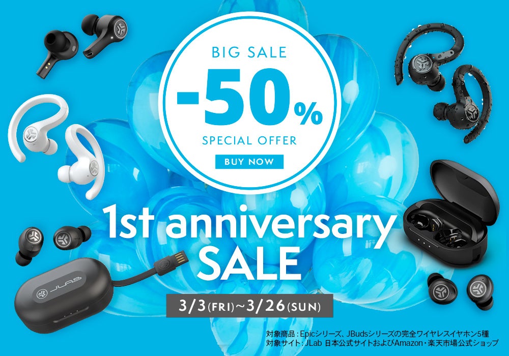 JLab Japan株式会社(以下、JLab Japan)は、2023年3月3日(金)~ 2023年3月26日(日)の期間、日本公式サイト1周年を記念し「1st ANNIVERSARY THANKS SALE」と題した特別セールを「JLab 日本公式サイト(公式通販)」「Amazon内公式ショップ」「楽天市場内公式ショップ」にて開催いたします。