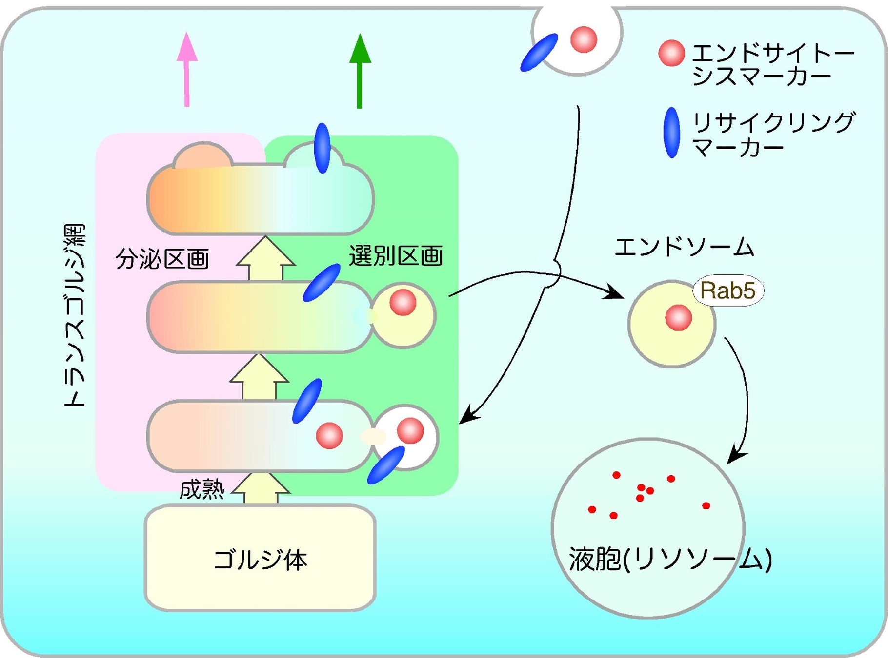 図3.トランスゴルジ網の選別区画を介したエンドサイトーシス経路の模式図
