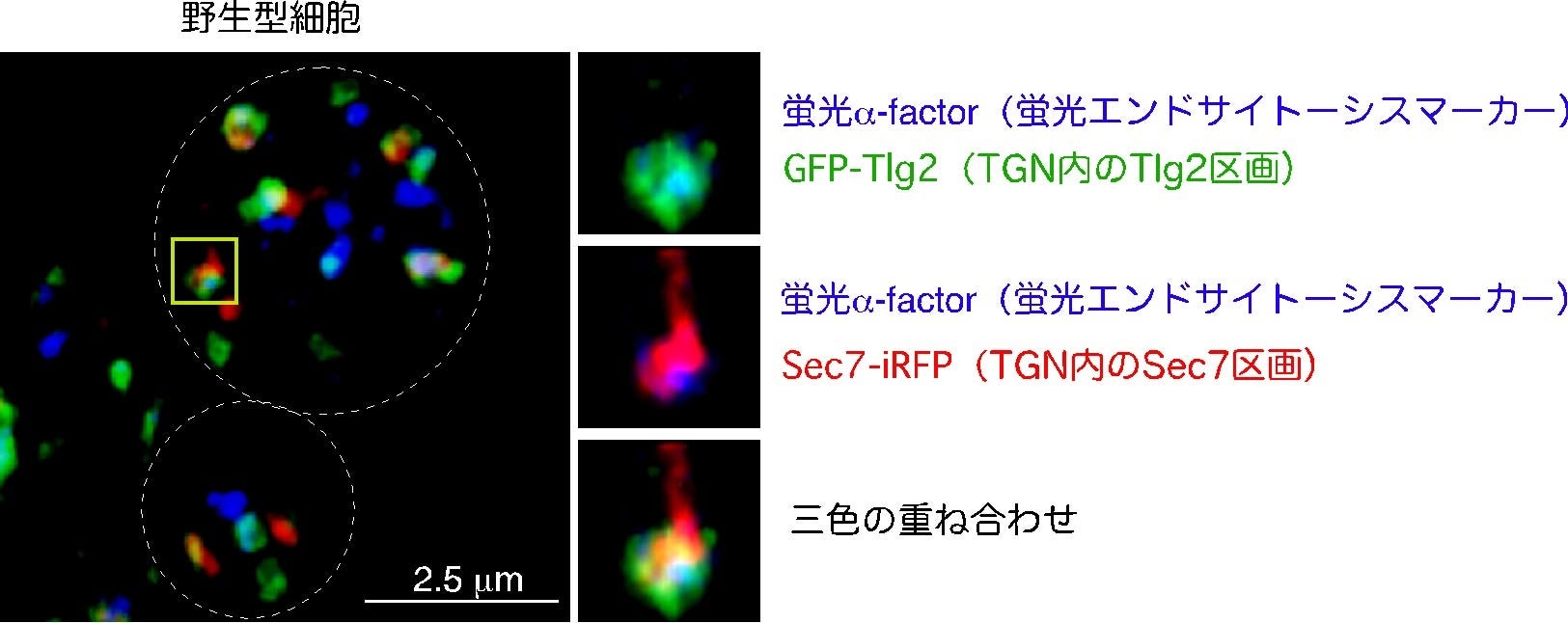 興味深いことに、Tlg2区画は同じTGN内で分泌に関わると考えられる区画(図2、Sec7区画)とは空間的に分離しているため、分泌に関わる区画とエンドサイトーシスの選別区画は独立した区画である可能性が示唆されました(図3)