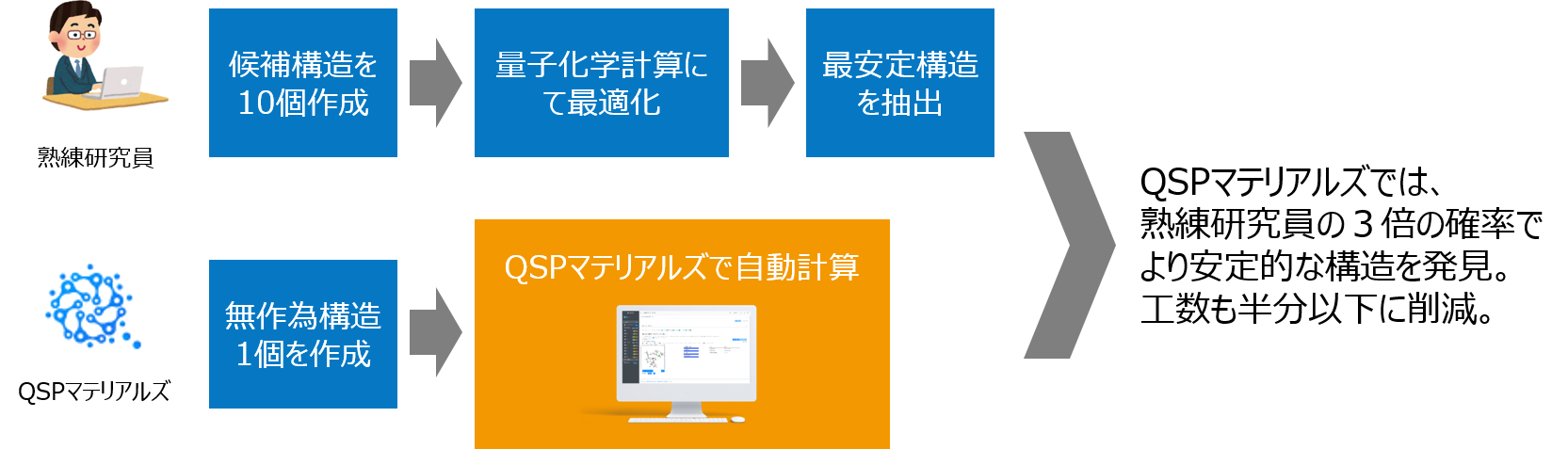 この2つの方法の結果を比較したところ、QSPマテリアルズは、手動による最安定構造の探索よりも3倍以上の確率でよりエネルギー的に安定な構造を発見できることが実証されました。また、QSPマテリアルズによる工数削減率は、0.45となり、従来かかっていた工数を半分以上削減できることが判明しました。