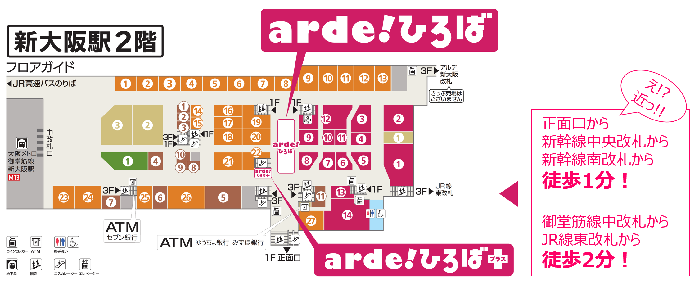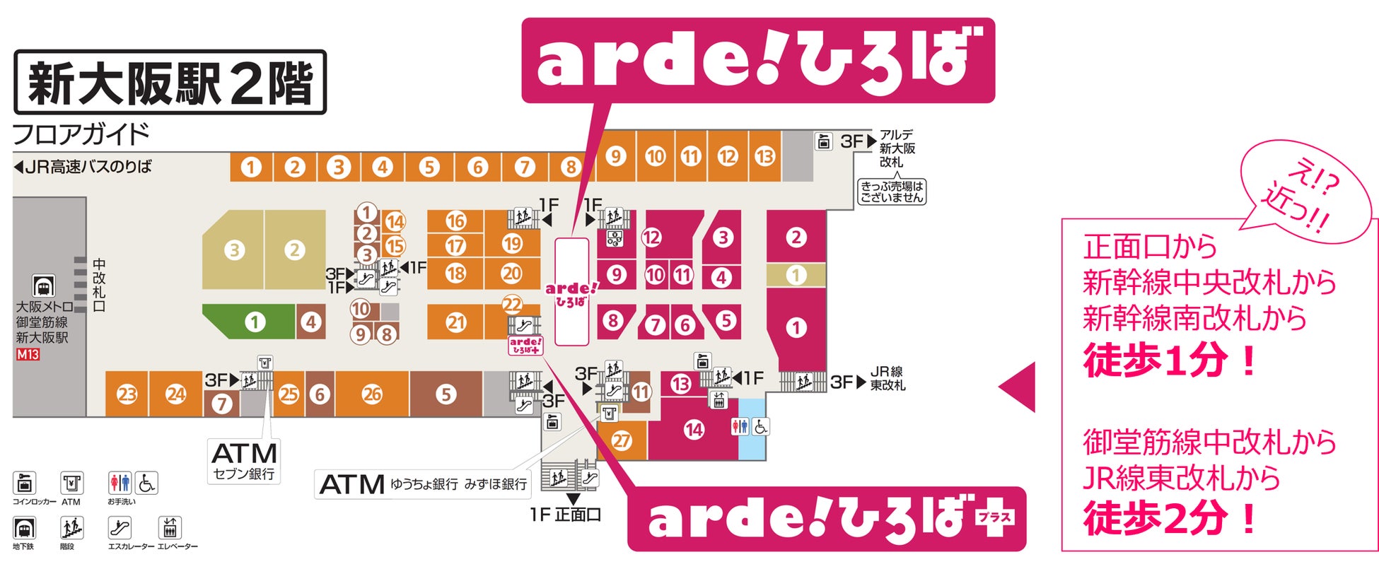 JR線東改札・新幹線中央改札・南改札からはひとつ下の2階へ。御堂筋線中改札からは出口➎スグにあります。