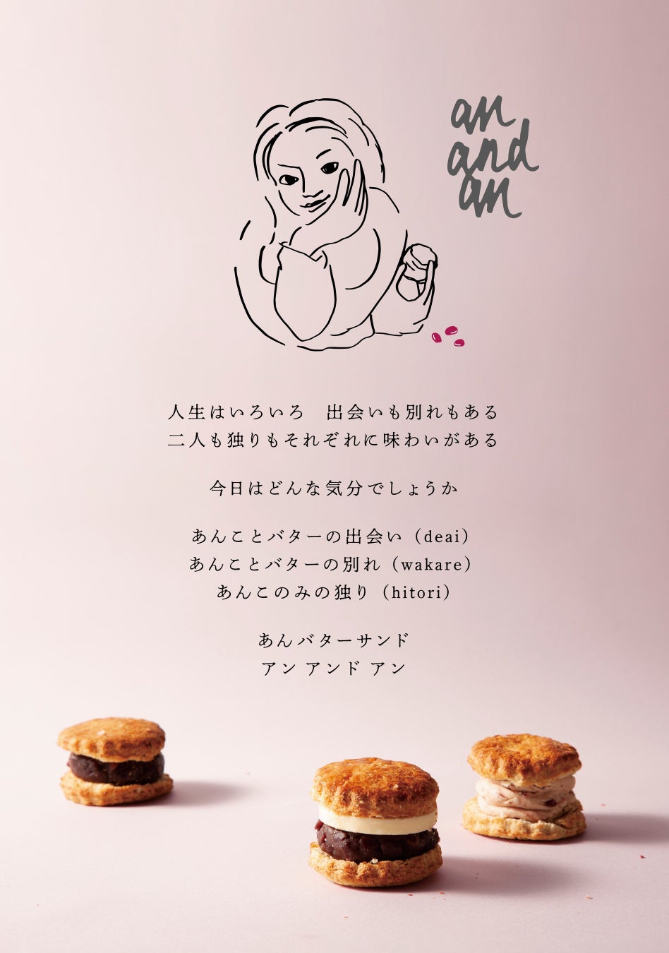 「あんことバターの出会い」「あんことバターの別れ」「あんこのみの独り」という3つタイプがございます。あんこの種類は小豆、宇治抹茶、いちじくをご用意しております。
