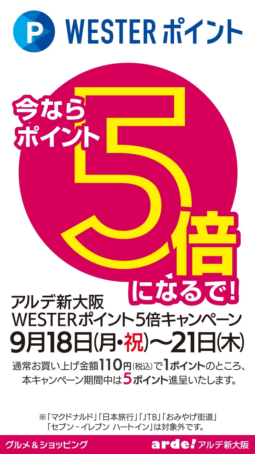 9月18日(月)~9月21日(木)までの期間中に、アルデ新大阪でWESPOアプリまたはWESTERアプリを提示してWESTERポイントをためると、通常は110円(税込)で1ポイントのところ、110円(税込)で5ポイントたまります!!(WESTERポイントでのお支払いでも、5倍たまる!!)