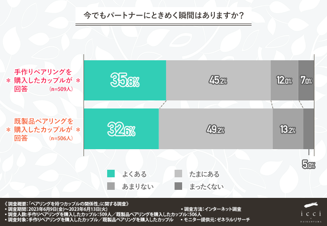 さらに、およそ36%の手作りペアリング購入カップルが『パートナーにときめくことが『よくある』と回答しているのに対し、既製品ペアリング購入カップルの回答率は約33%という結果が出ました。