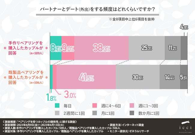 【手作りペアリング購入カップル】『毎日(8.1%)』『週に4~6回(9.0%)』『週に1~3回(38.3%)』