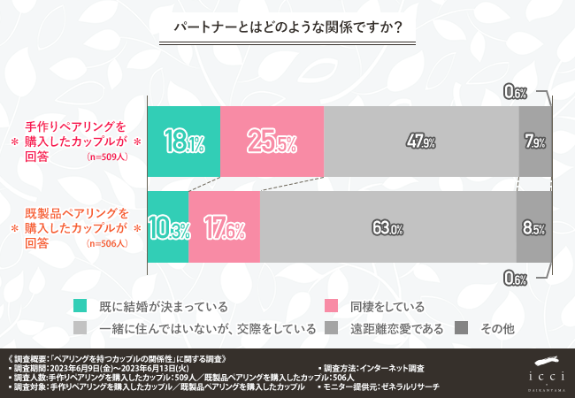 そこで今回、手作りペアリングの制作体験ができるicci代官山(https://www.1-daikanyama.jp/)を運営する株式会社一は、手作りペアリングを購入したカップルと既製品ペアリングを購入したカップルを対象に、「ペアリングを持つカップルの関係性」に関する調査を実施しました。