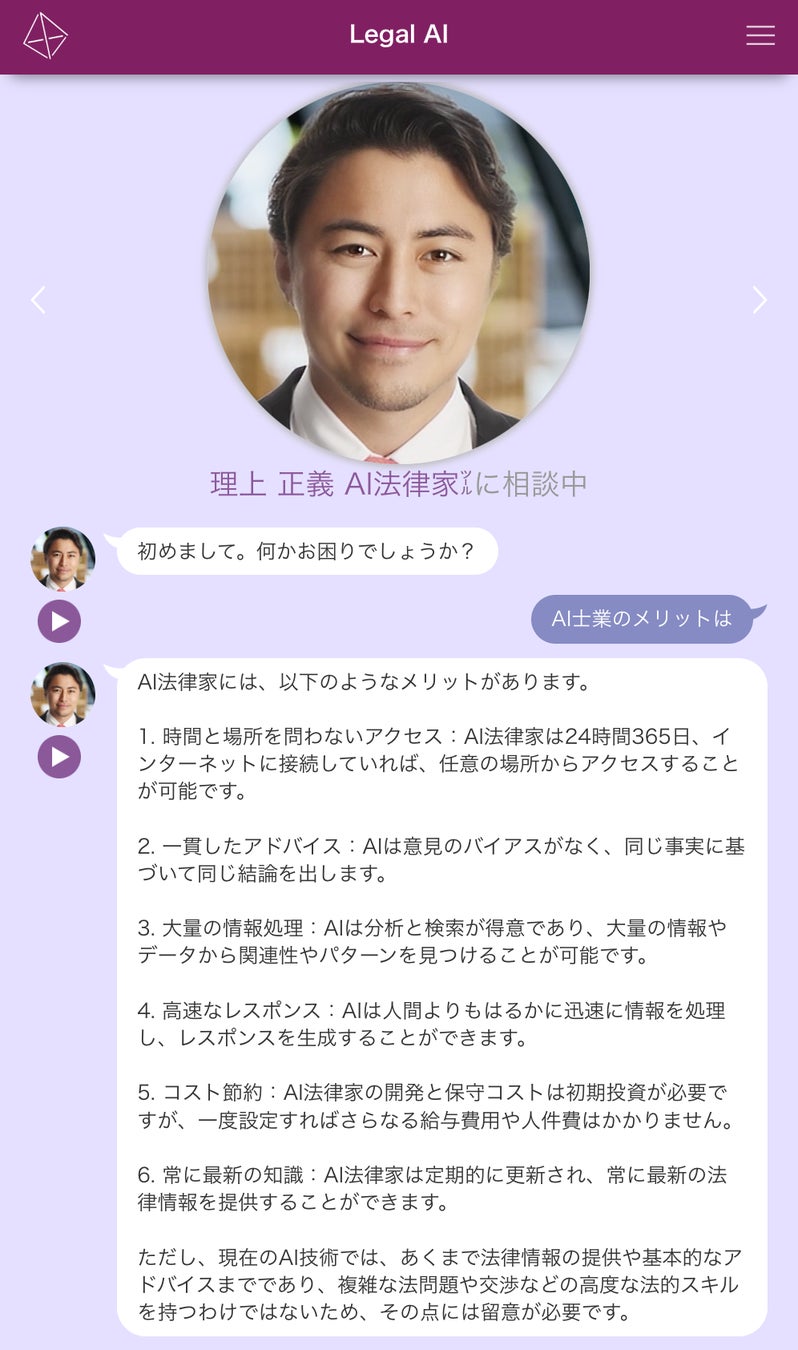 法律業務に携わる弁護士、会計士、税理士、司法書士、行政書士等の方々(事務所)向けに、自分にそっくりなAIアシスタントを提供します。