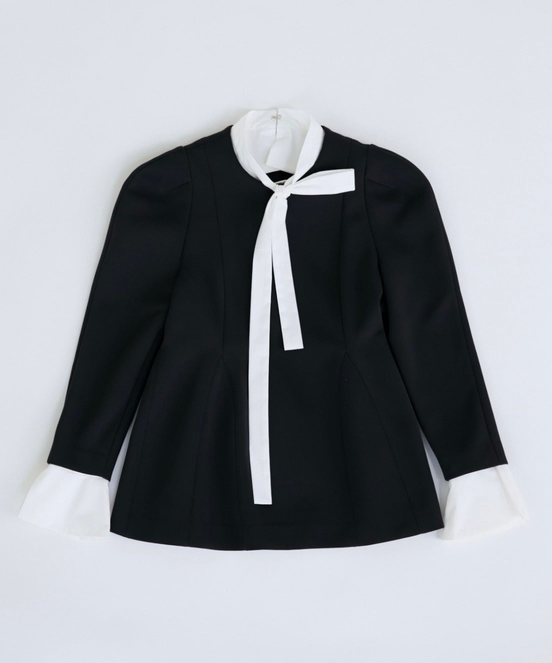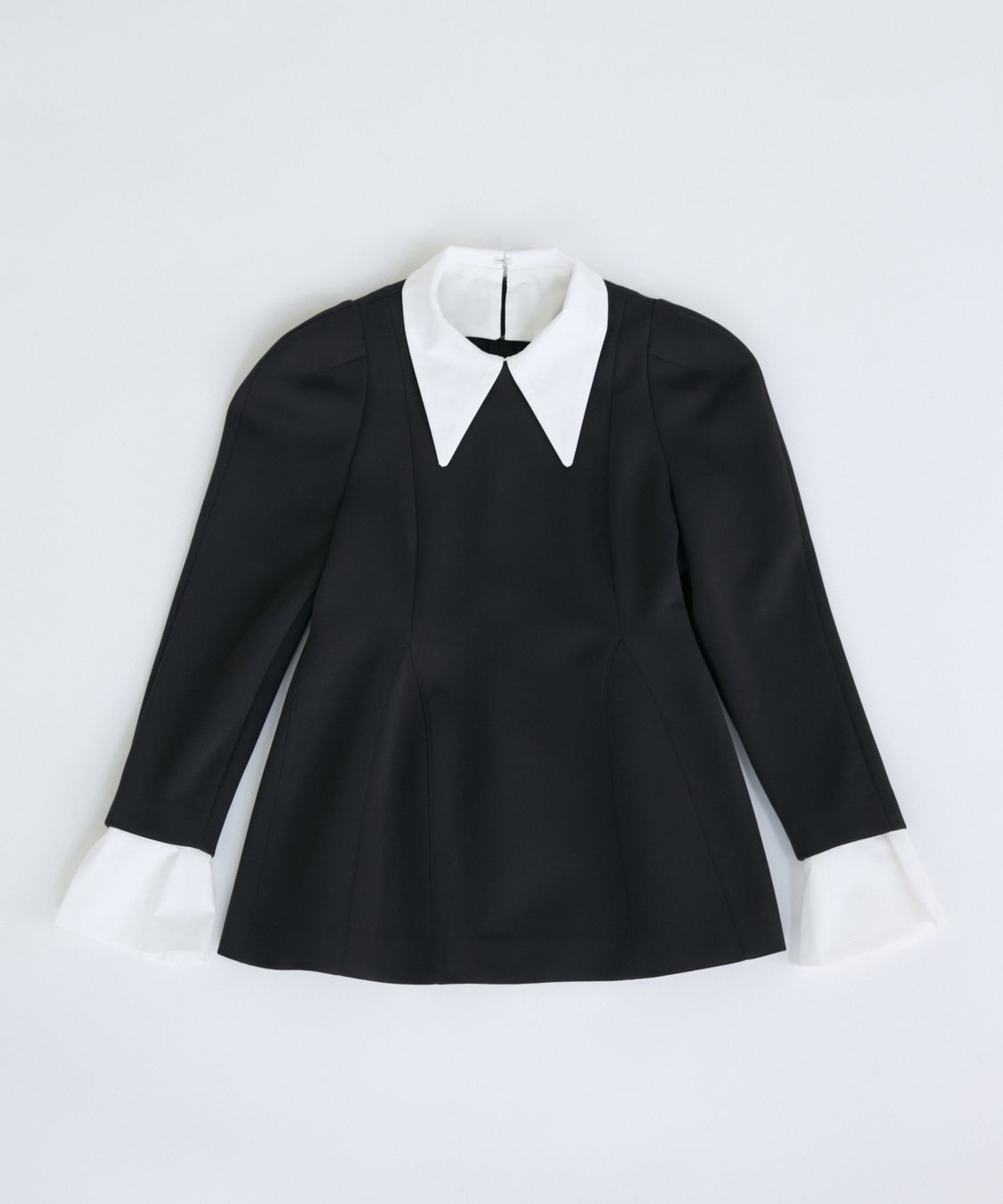 付け衿2パターンとカフスが取り外し可能でイメージチェンジが自在に楽しめる1枚2役以上の着回し力。身体のラインをきれいに魅せてくれる3Dペプラムシルエットやふんわり袖が大人の甘さをほんのり漂わせてくれるデザインで同素材のパンツ合わせで大人の甘辛バランスに。シワになりにくいハリ感素材だから長時間の着席があるシチュエーションでも気兼ねなく着られます。